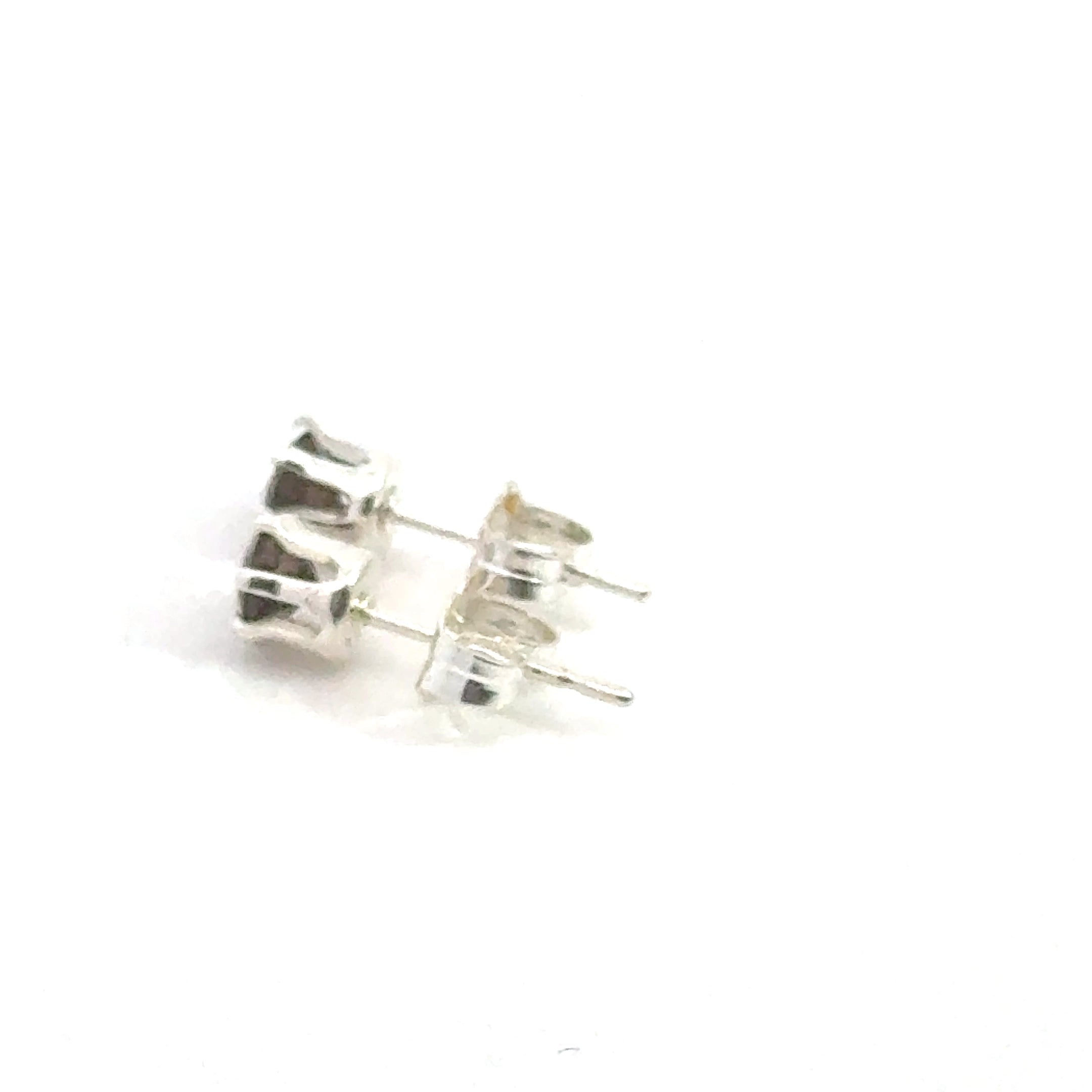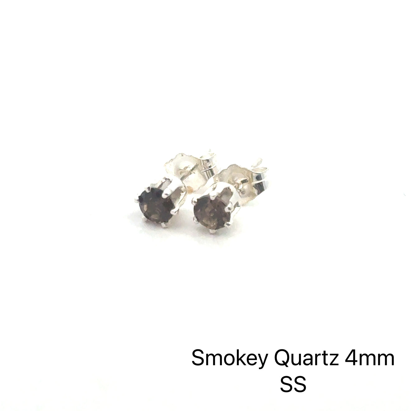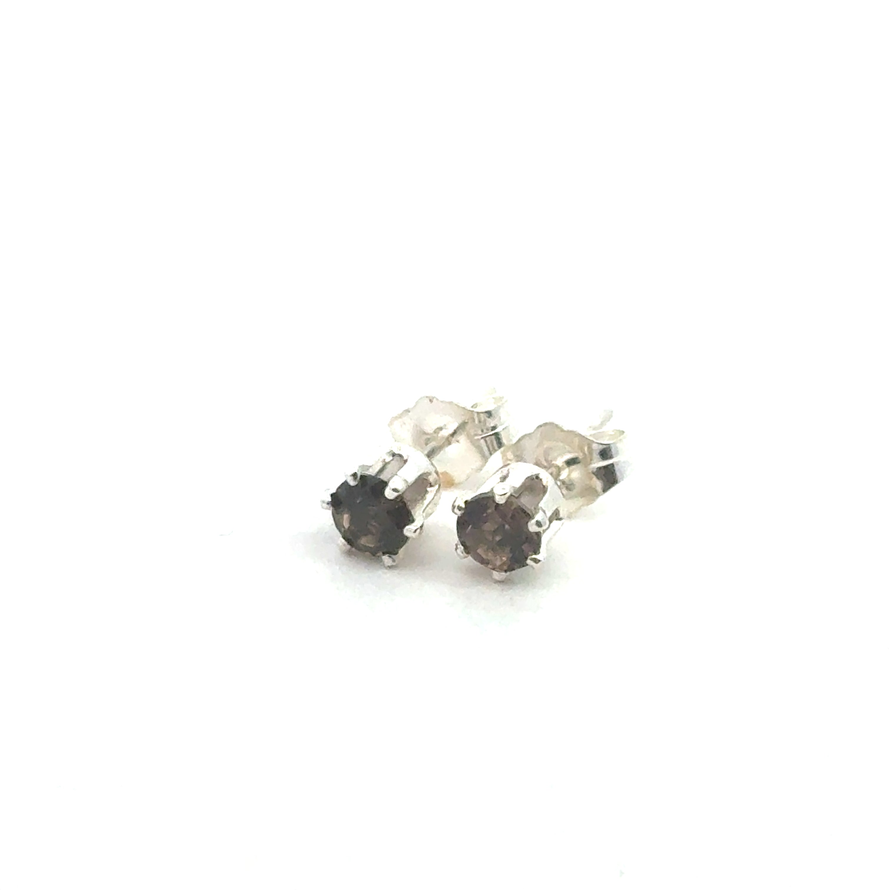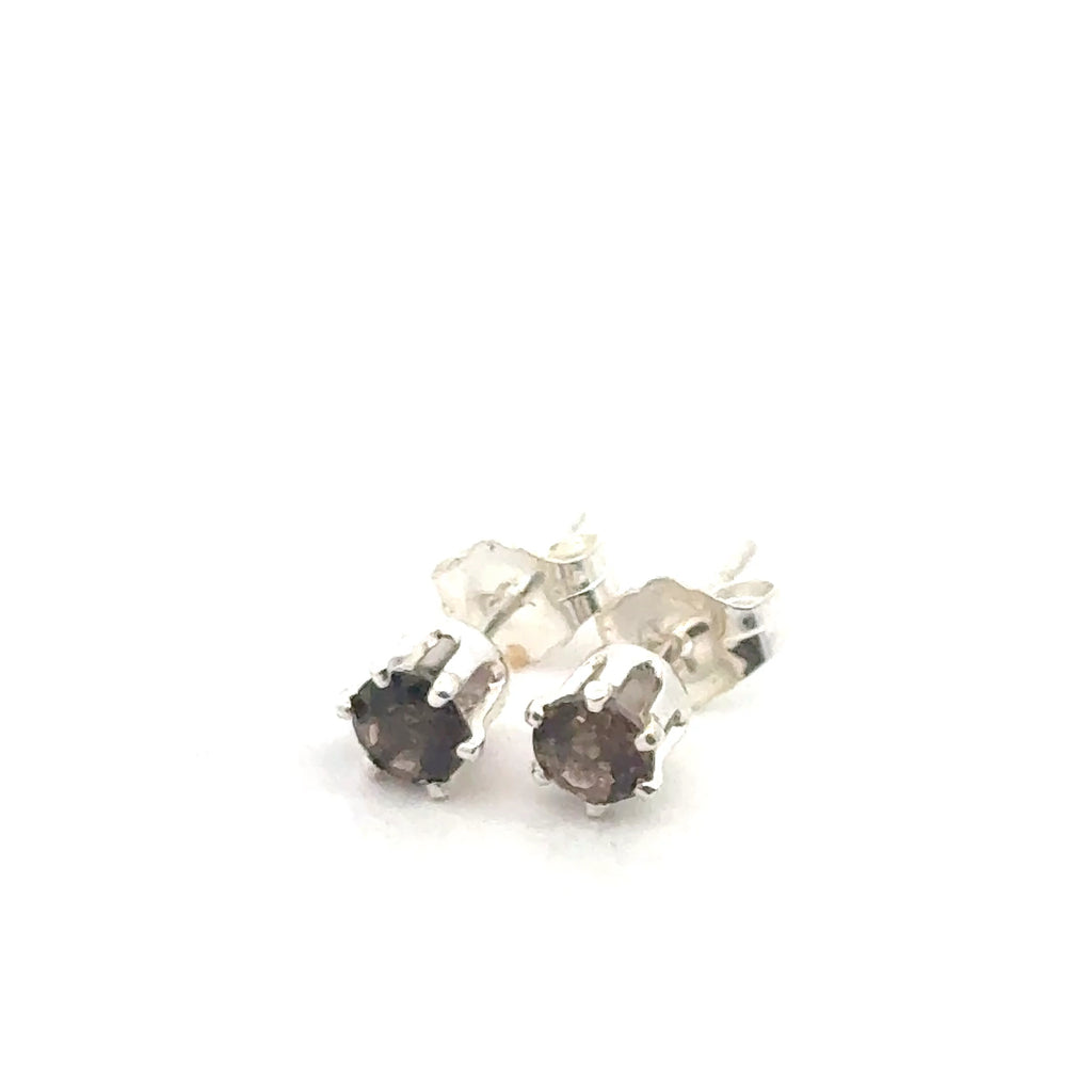 These round post earrings feature semi-precious Smokey Quartz gemstone cut stones prong-set in sterling silver with sterling silver push-backs. Earrings are in a hand-forged Sterling Silver basket double-prong setting. Smokey Quartz stones are 4mm round.