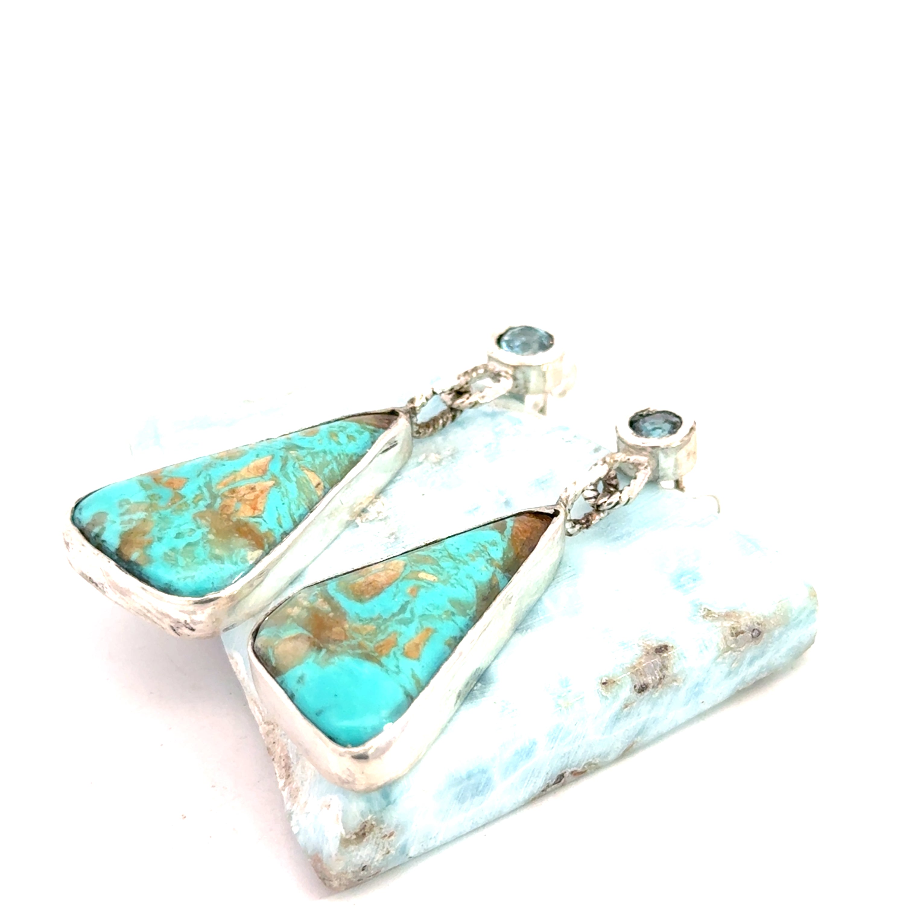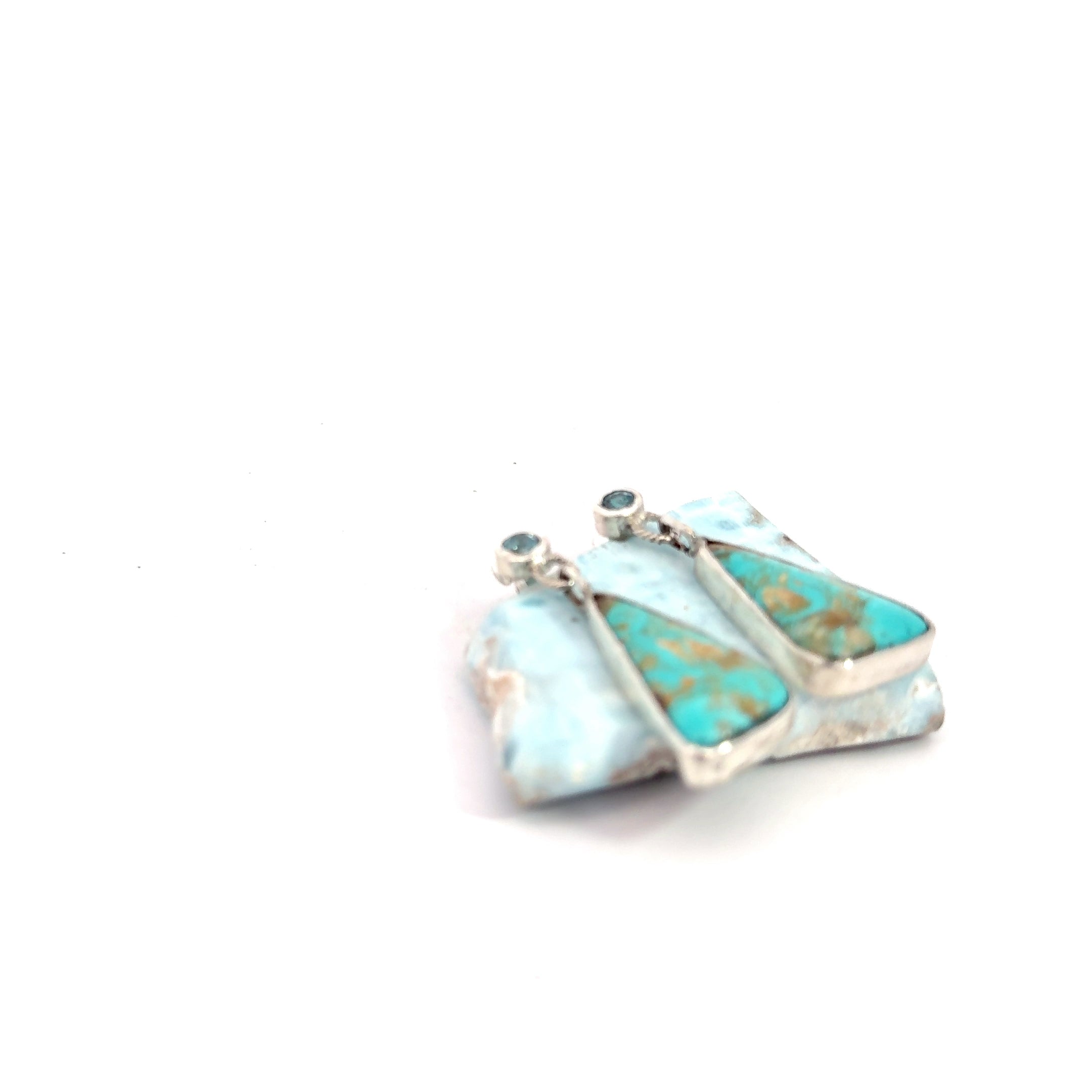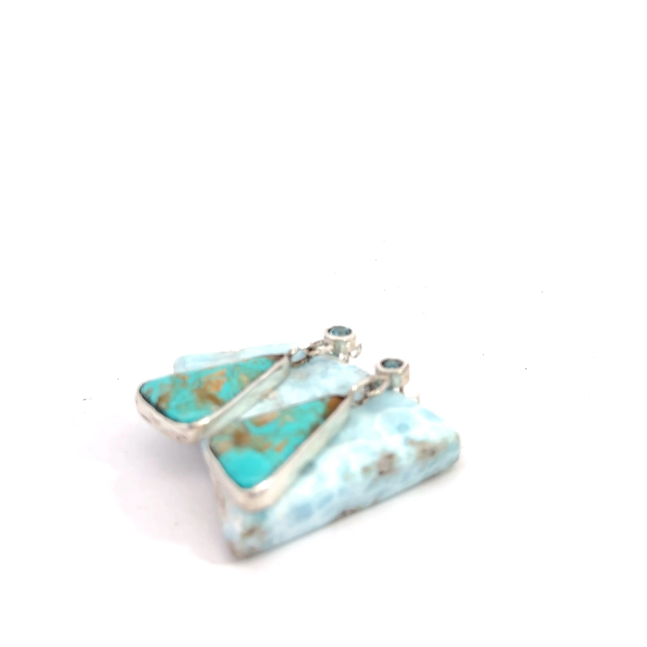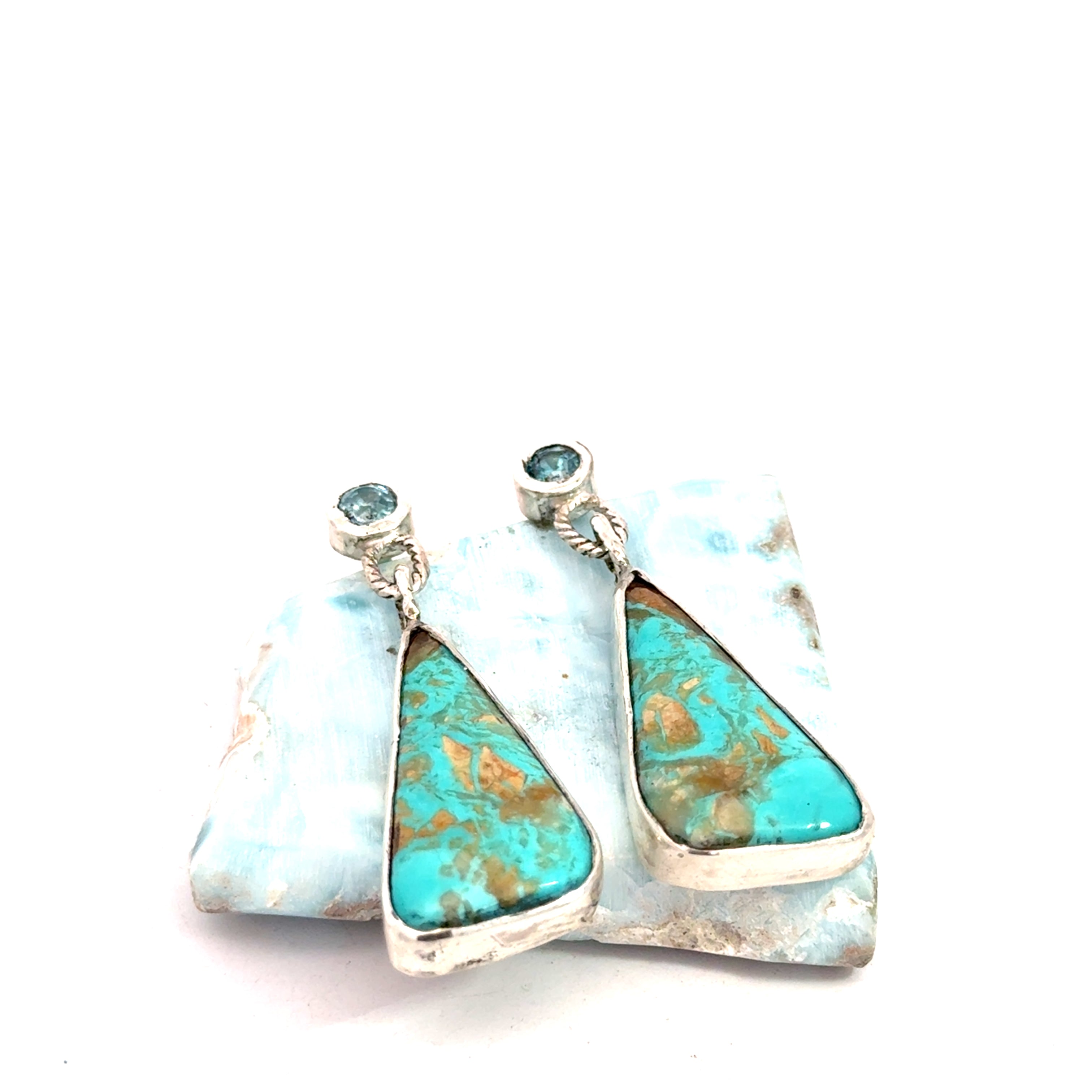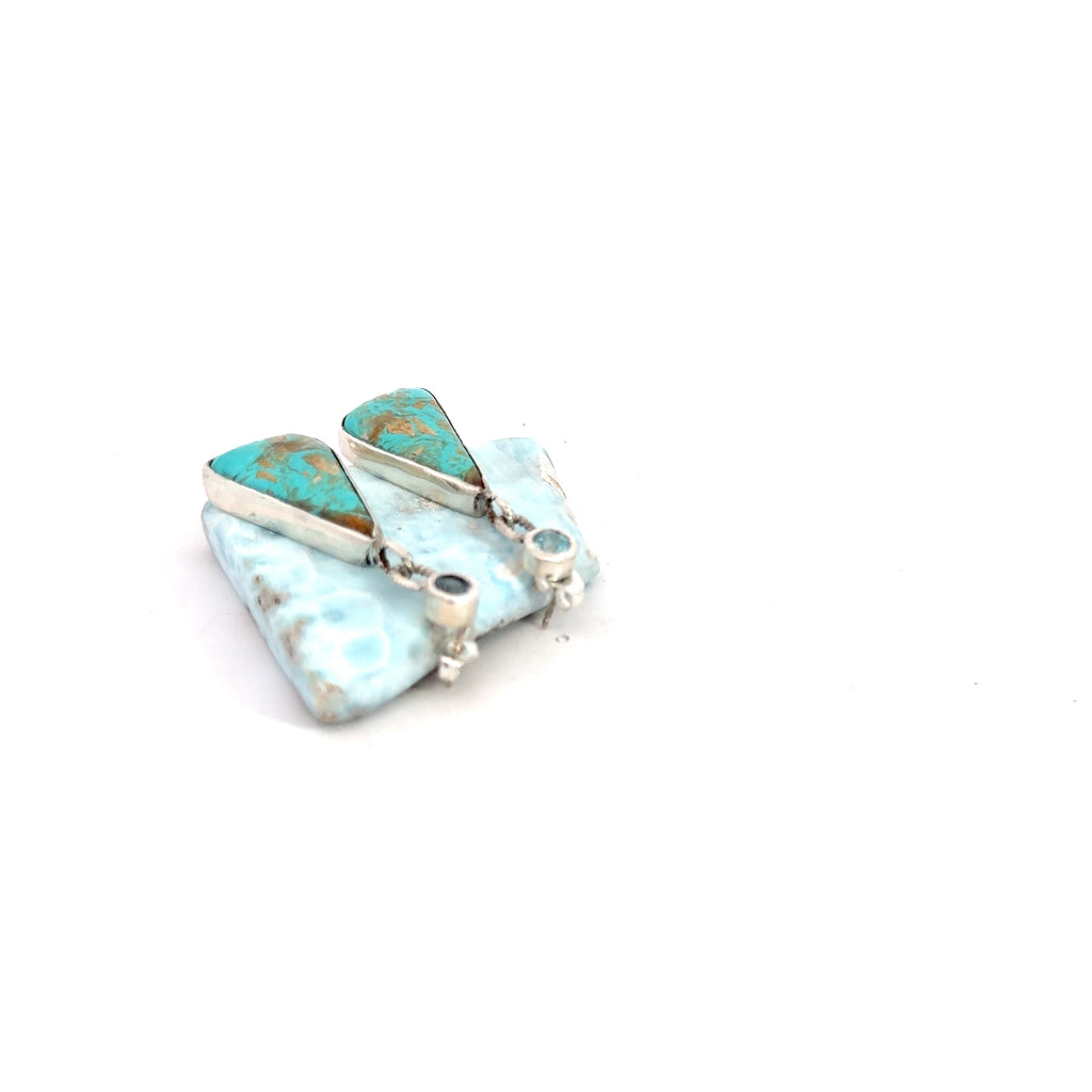 These are genuine Blue Zircon and Turquoise gemstone stud and drop earrings.  The turquoise is from the Royston mine in Nevada. A 6mm faceted Blue Zircon gemstone was bezel set, and a 27 x 14mm triangle-shaped turquoise was bezel set in a sterling silver bezel. The earrings are sterling silver posts. An excellent gift for someone special or for yourself. Earrings that can be worn every day and dress up an outfit, too. This Natural American Turquoise is a genuine gemstone.