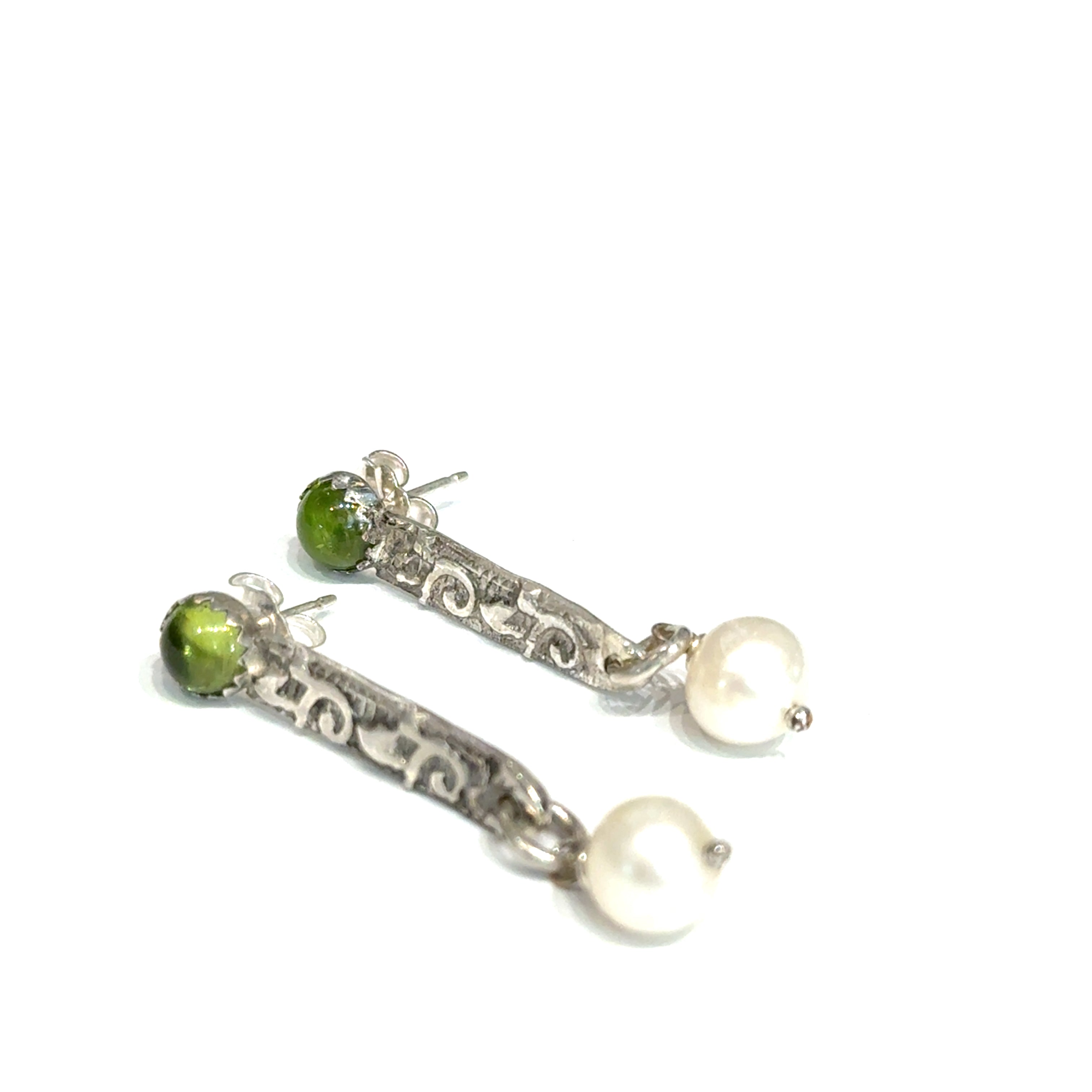 Freshwater Pearl & Peridot Gemstone Earrings – 7mm White Pearls, Sterling Silver Posts, 1.5" Drop