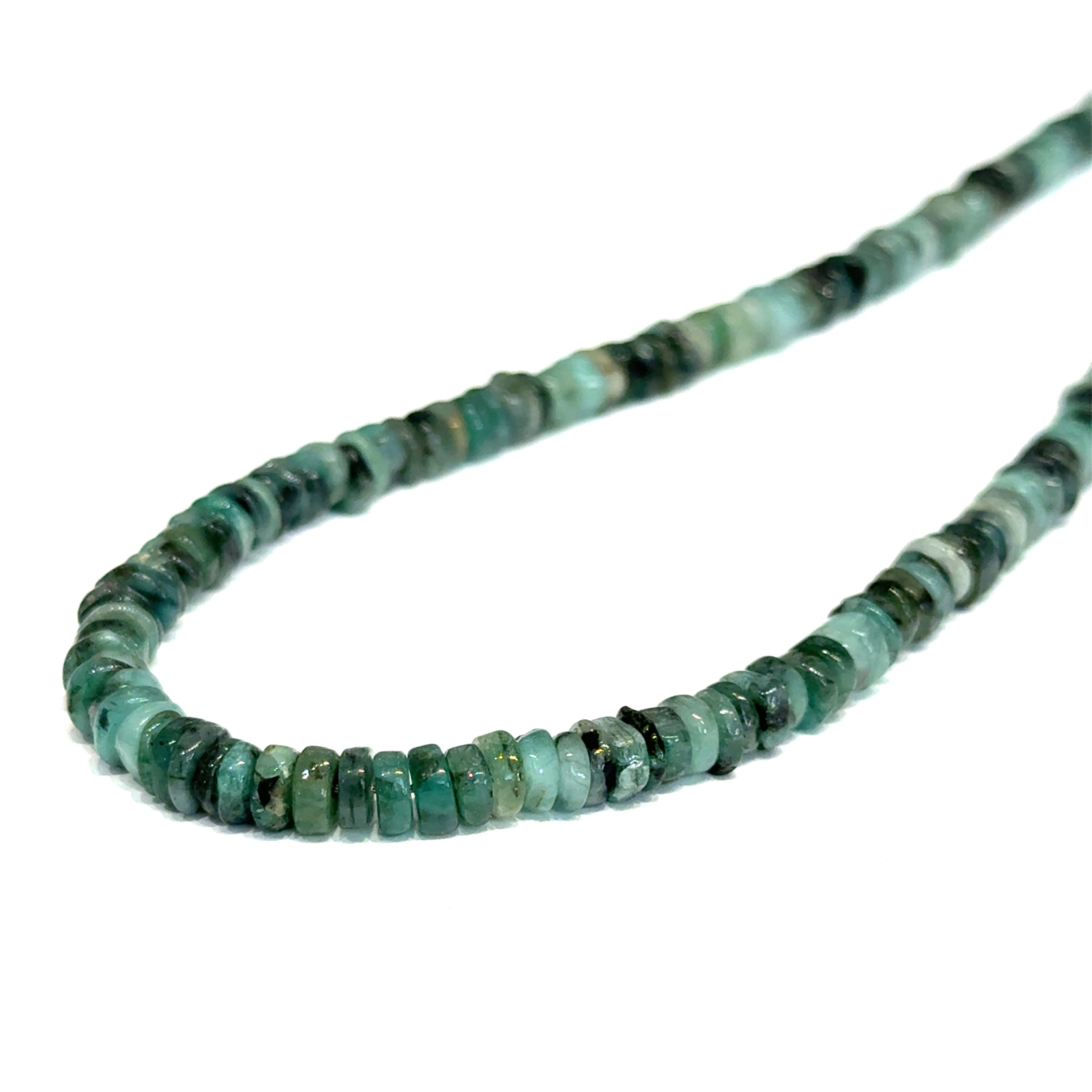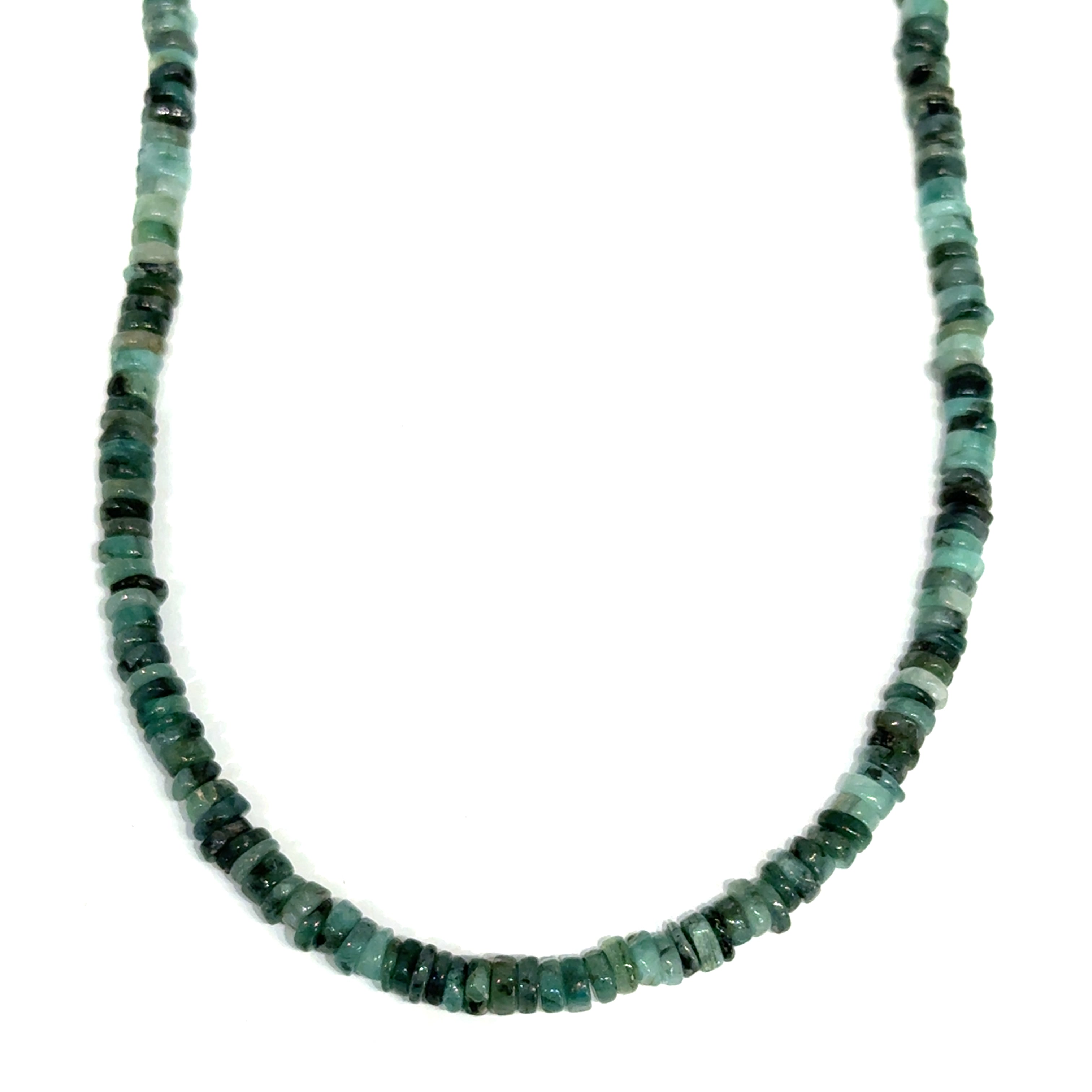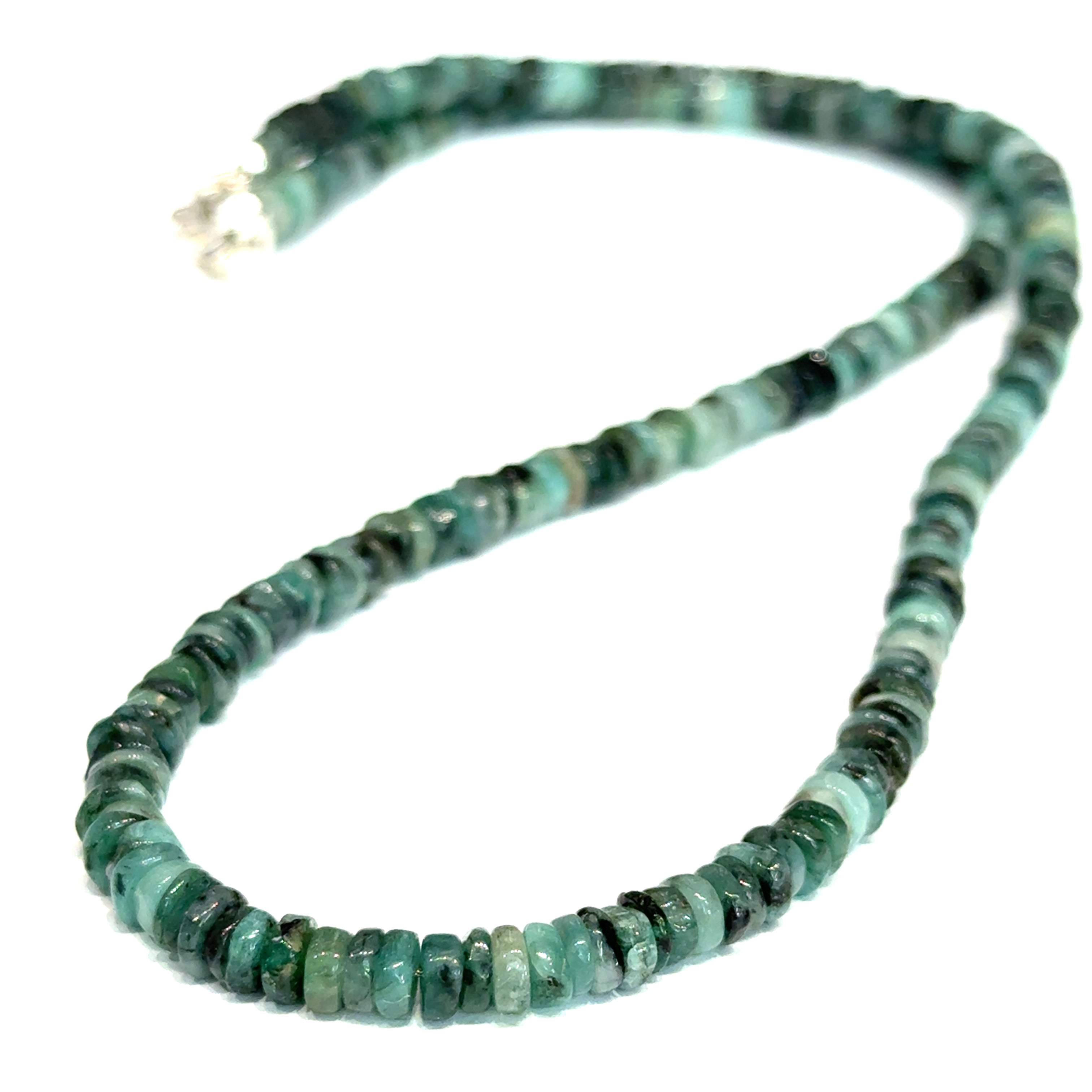 Elevate your jewelry collection with this stunning Genuine Emerald Necklace, meticulously handcrafted in our South End Boston studio. Each necklace is strung on durable Beadalon wire and finished with a Sterling Silver lobster claw clasp for both elegance and strength. Measuring 21 inches, this one‑of‑a‑kind piece showcases the timeless beauty of heshi-cut emerald gemstones, carefully curated from family‑owned suppliers.