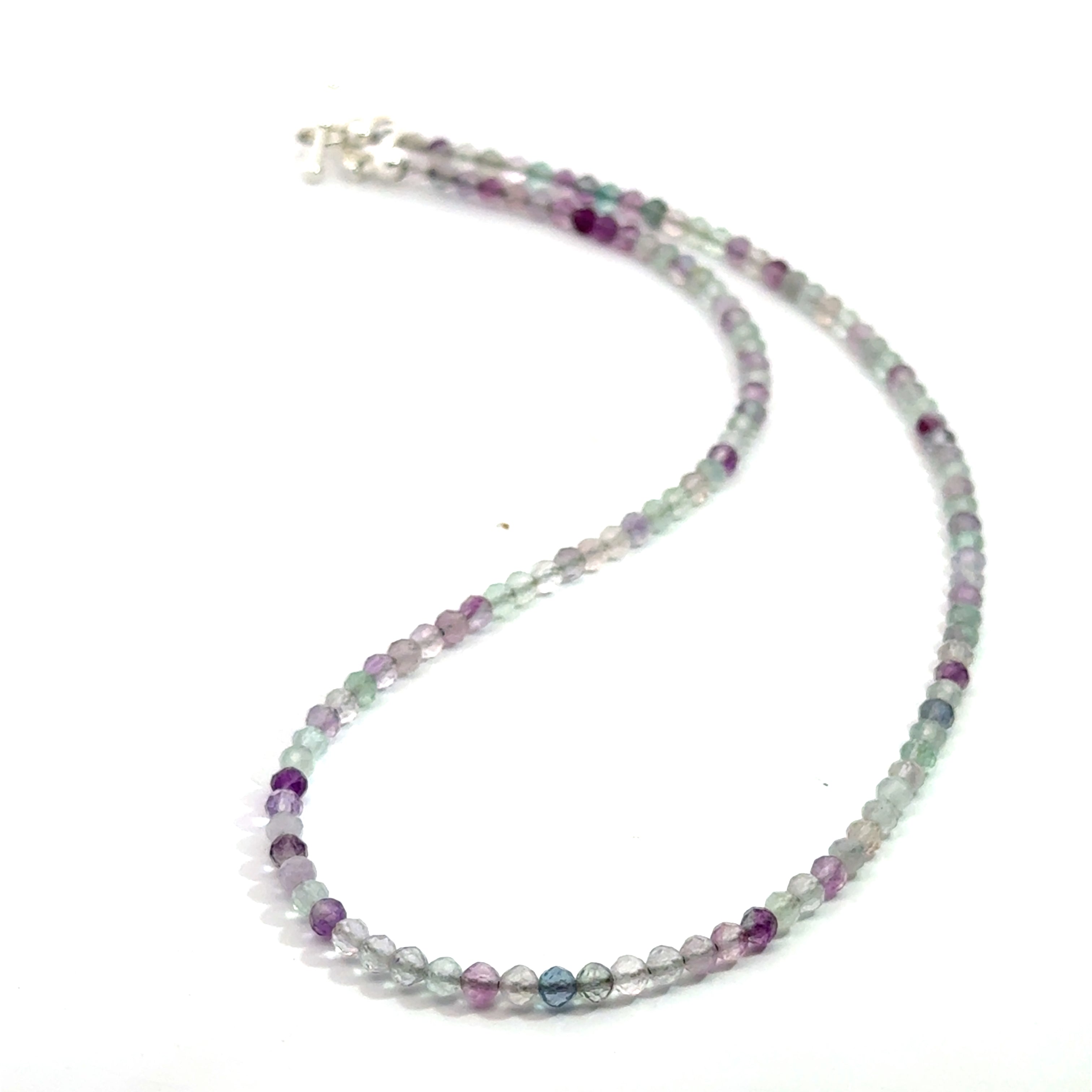 Elevate your jewelry collection with this genuine Fluorite gemstone necklace, a versatile piece that blends elegance with powerful metaphysical properties. Handcrafted with 3mm faceted round Fluorite beads, strung on durable beaded wire, and finished with a sterling silver toggle clasp, this necklace measures 16 inches—perfect for wearing solo or layering with other gemstone necklaces.