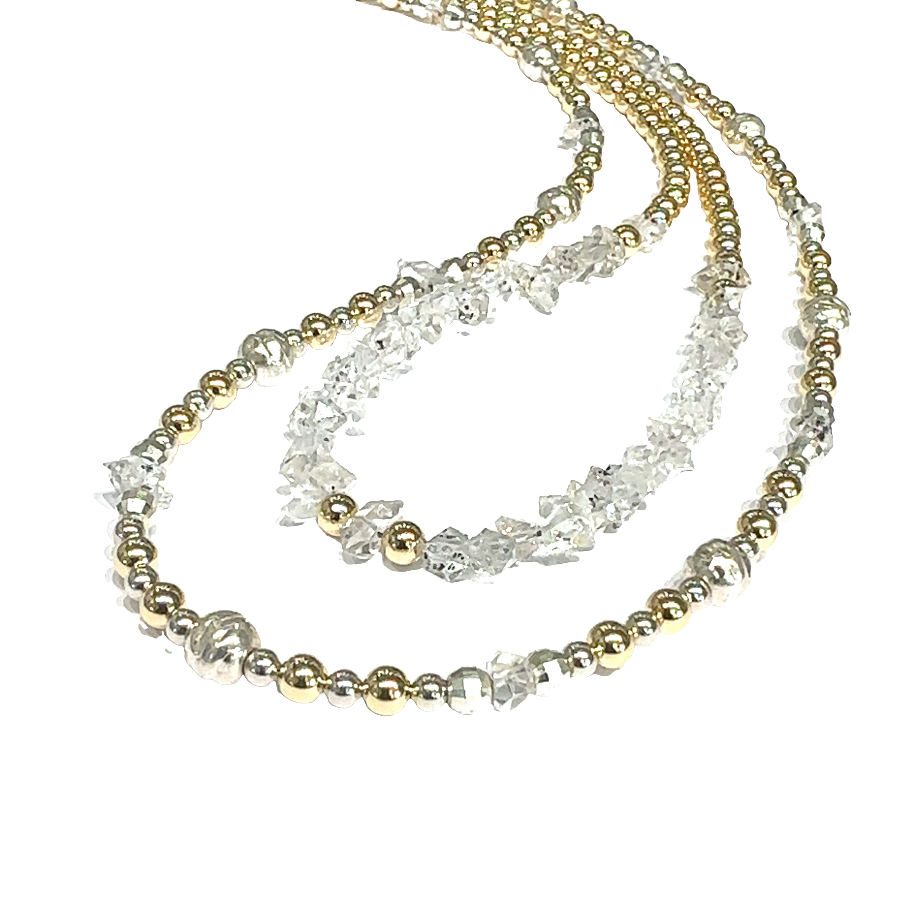 Discover the brilliance of our Herkimer Diamond beaded necklaces, available in two stunning styles: one accented with gold-filled beads and the other with sterling silver beads. These versatile necklaces can be worn separately or layered together for a chic, modern look.