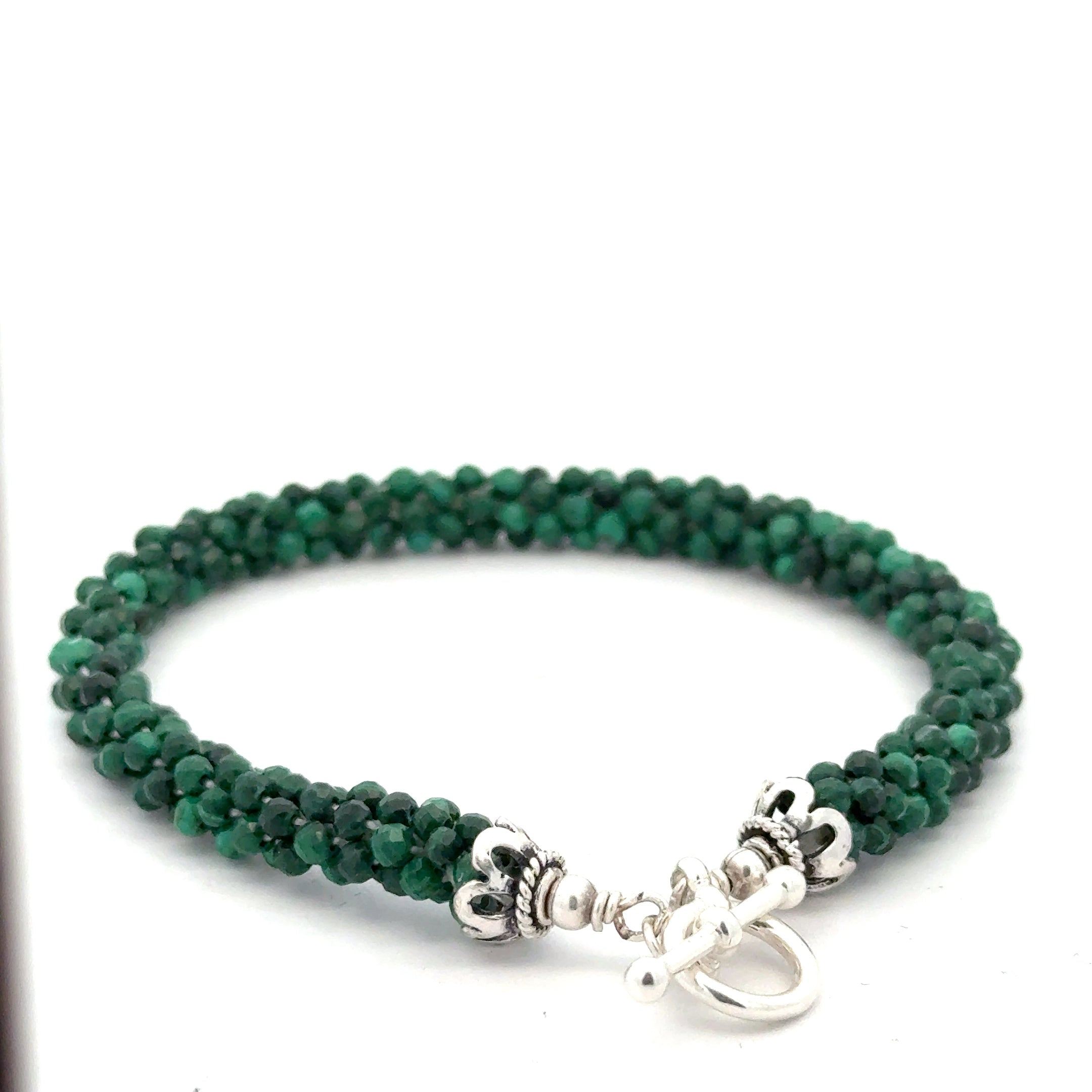 This handcrafted bracelet features lush green, micro-faceted malachite gemstones, known for their protective and transformative energy. Each stone is delicately crocheted into place, creating a soft, flexible band that feels as luxurious as it looks. Finished with a gleaming sterling silver toggle clasp, this piece offers both security and sophistication.