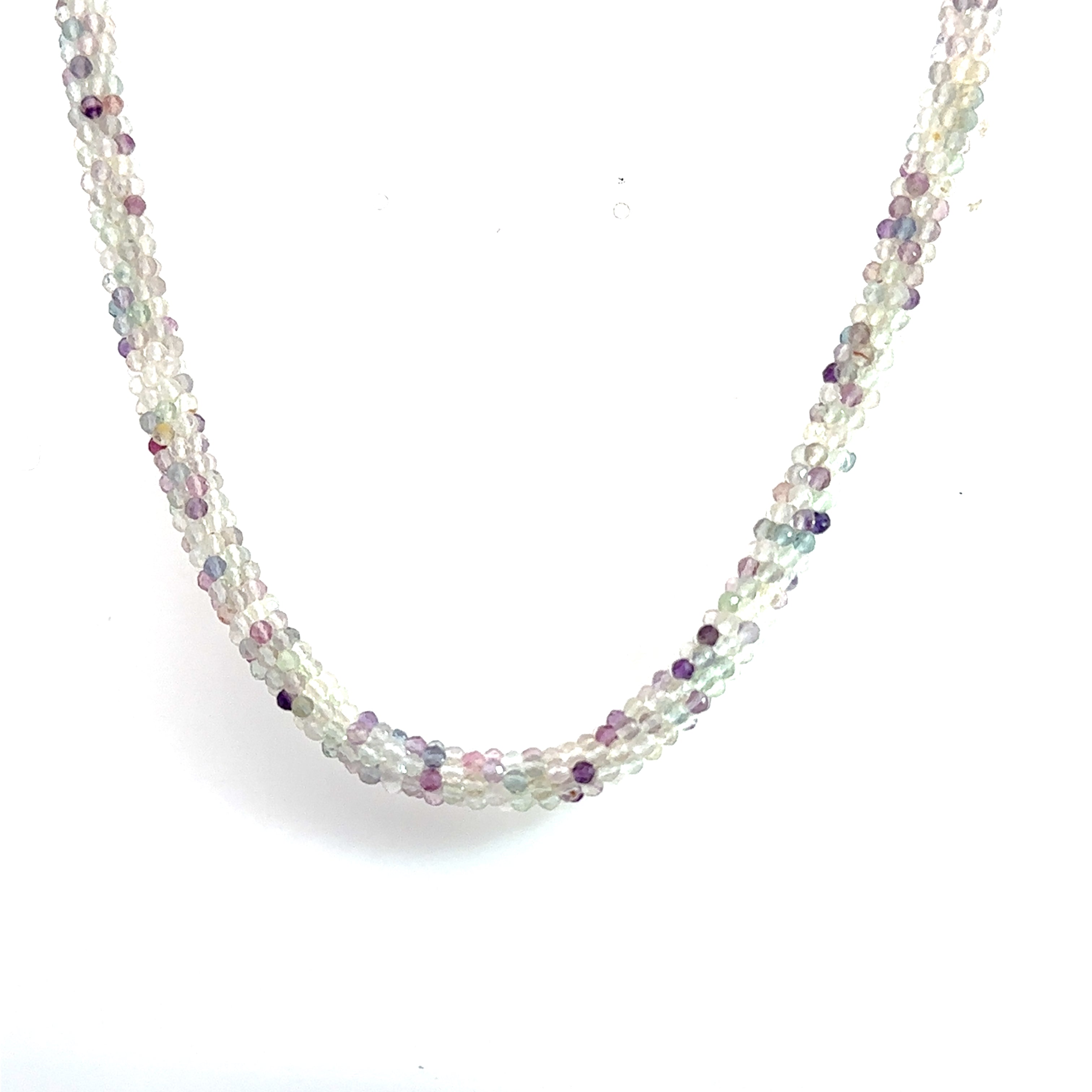 Elevate your style and energy with this Rainbow Fluorite Gemstone Necklace, a one-of-a-kind piece handcrafted in Boston’s South End. Tiny 2mm faceted Fluorite gemstones are strung on a sturdy fireline cord and hand-crocheted into a tubular pattern, finished with a sterling silver circle box clasp and a radiant Rainbow Fluorite cabochon.