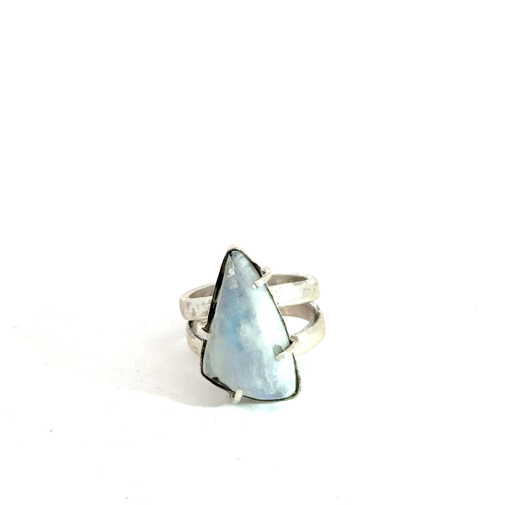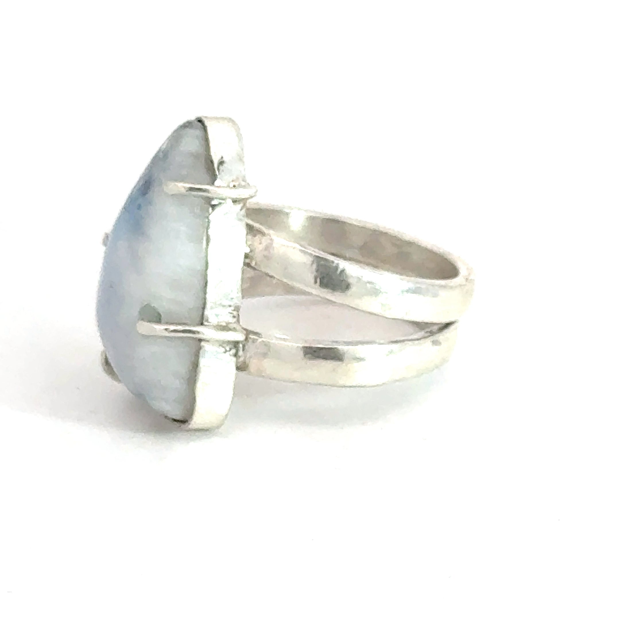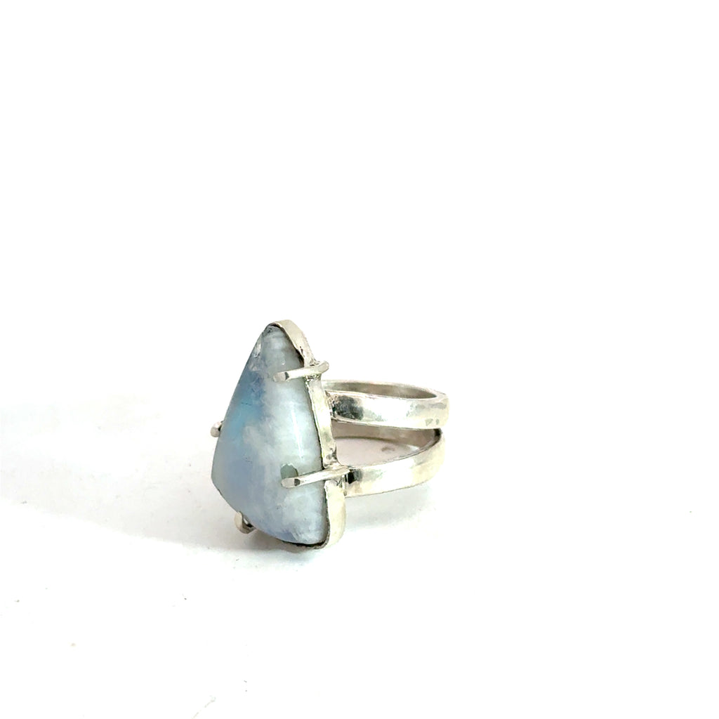 This stunning Rainbow Moonstone gemstone ring is a statement piece for sure! The Rainbow Moonstone is a beautiful stone with outstanding clarity and is flawless. Rainbow Moonstone is a Cabachon cut and set in a Sterling Silver prong and bezel set with a simple Sterling Silver split band. Measurements of the Rainbow Moonstone are 21x15mm, a triangular-shaped gemstone, and the ring shank size is 7. A great ring to have in your/ someone special's jewelry collection. A piece that could be worn with any outfit to dress it up and/or a special event! A one-of-a-kind that no one else will have. What can you say about that? Rainbow Moonstone is also a fantastic healing stone. If you are interested in the healing properties of Rainbow Moonstone, they are listed below.