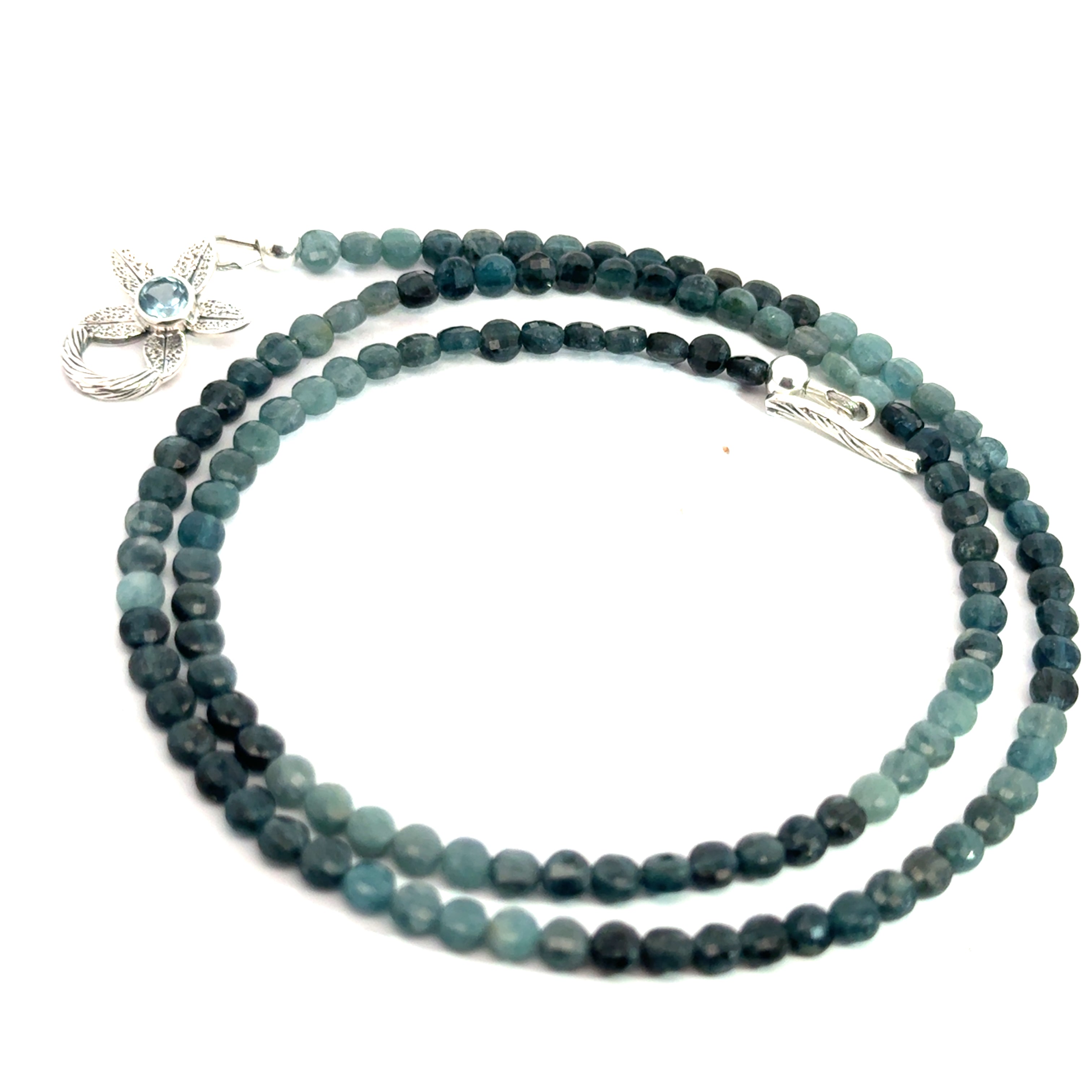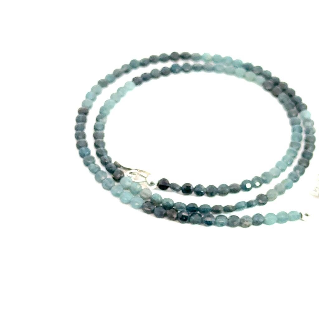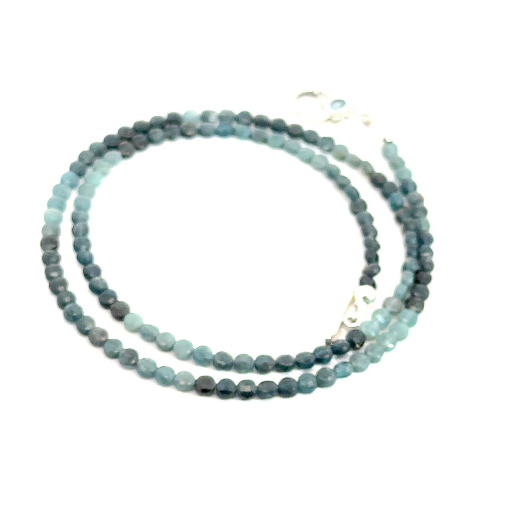 Bring the beauty of the ocean to your jewelry collection with this Genuine Grandidierite gemstone necklace, handcrafted in our South End, Boston studio. Inspired by cool summer nights and shimmering sea hues, this necklace features 3mm faceted coin Grandidierite beads accented with sterling silver and finished with your choice of a sterling silver heart toggle, box clasp, or blue topaz bezel flower toggle for an elegant touch.
