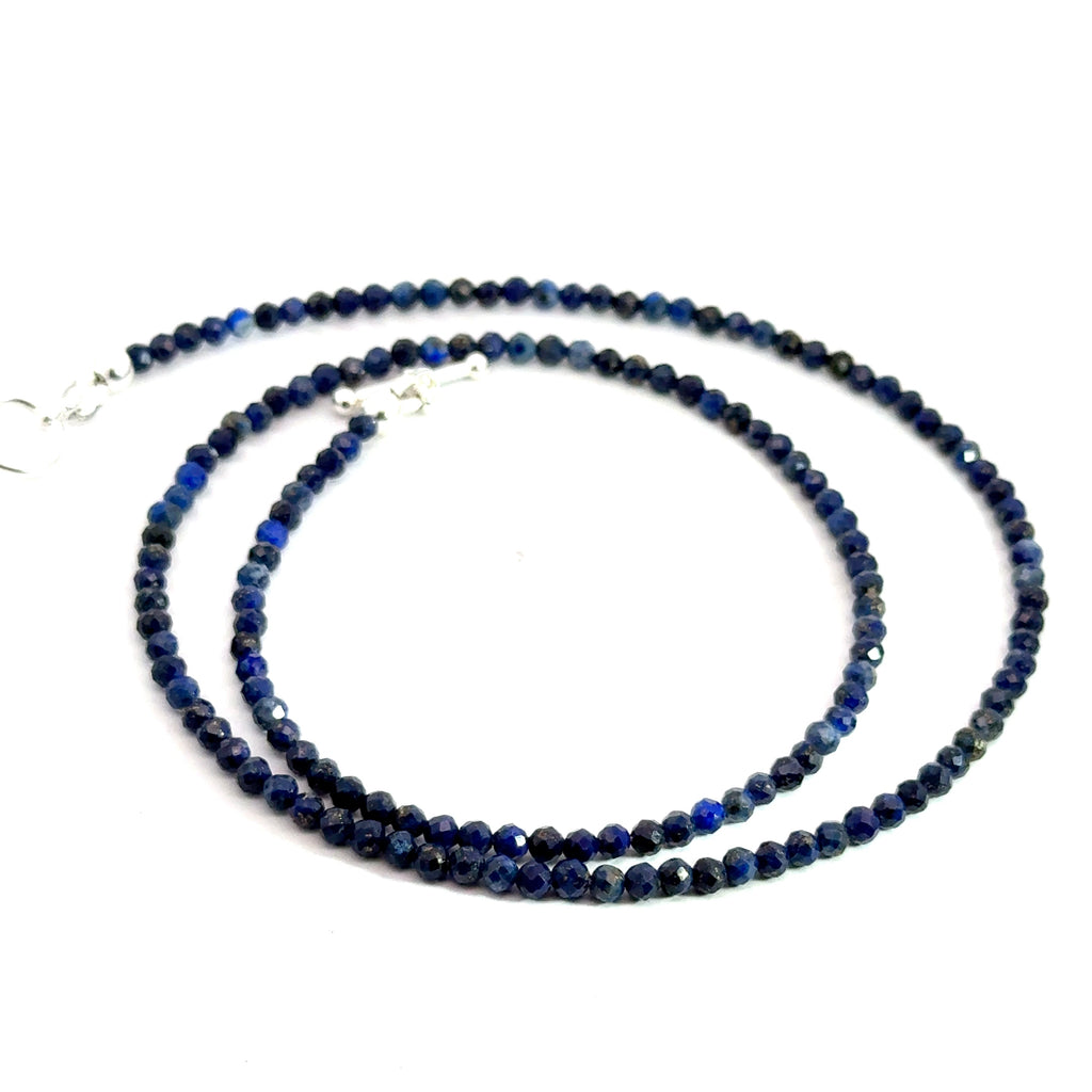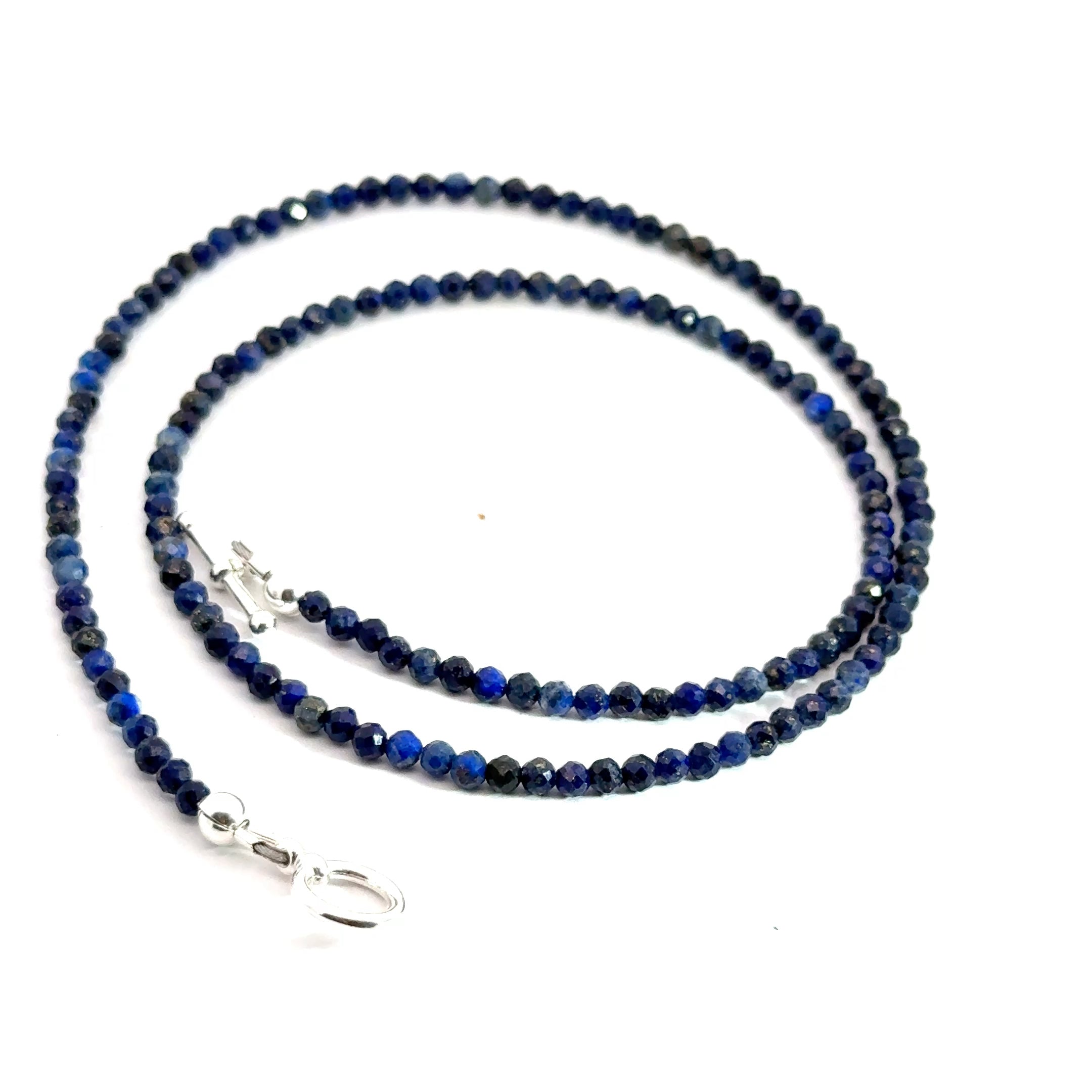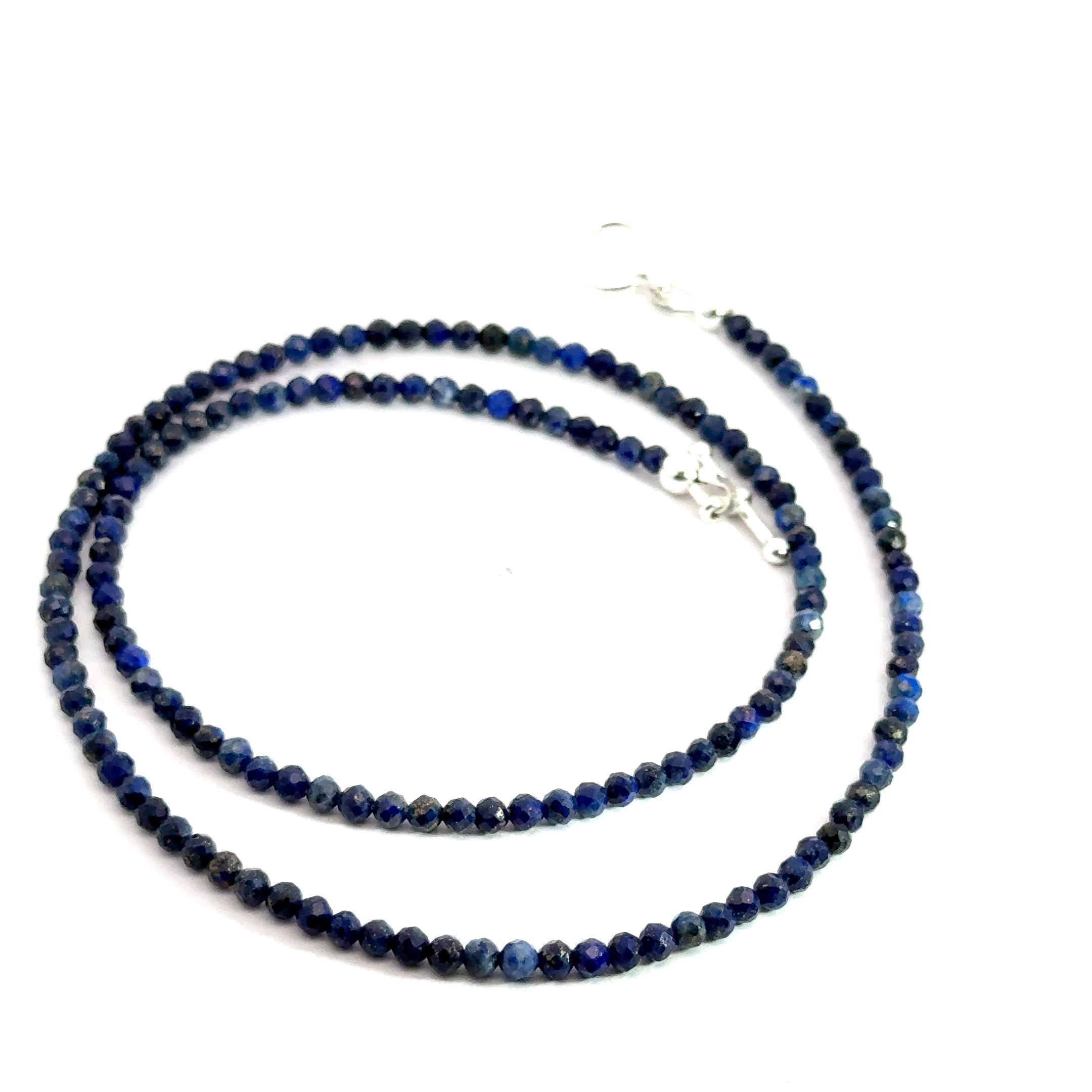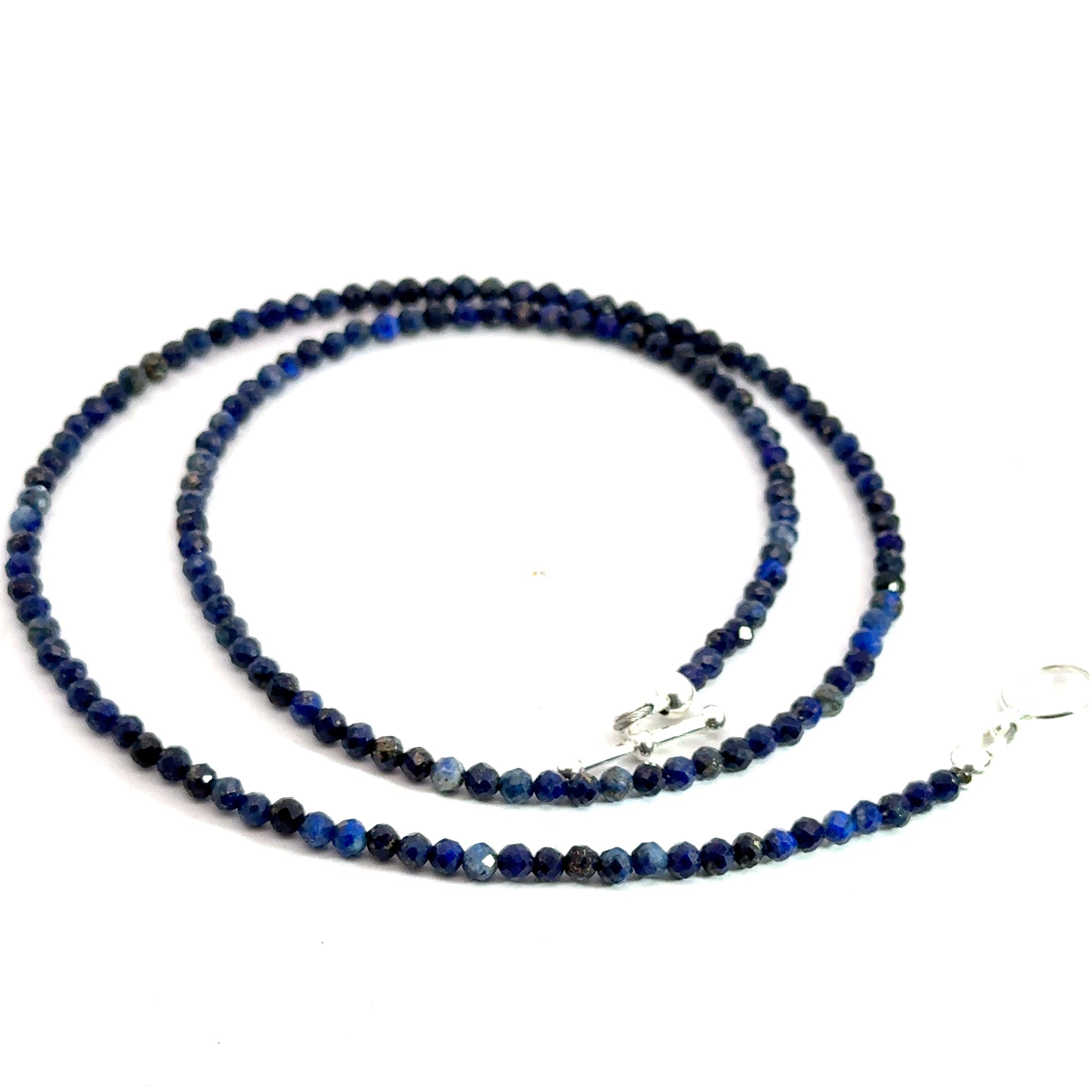 Genuine Lapis Lazuli 3mm faceted gemstones single strand necklace with a sterling silver toggle. The necklace measures out to 18.5''. The Lapis Lazuli necklace is exquisite but simple. A great piece to have in one's collection, perfect for daily wear or a special occasion. A necklace that could be worn by itself or layered with others. A must-have. There is a matching bracelet if you like to match your jewelry. There is also matching bracelets that are sold separately if you love matching jewelry sets.