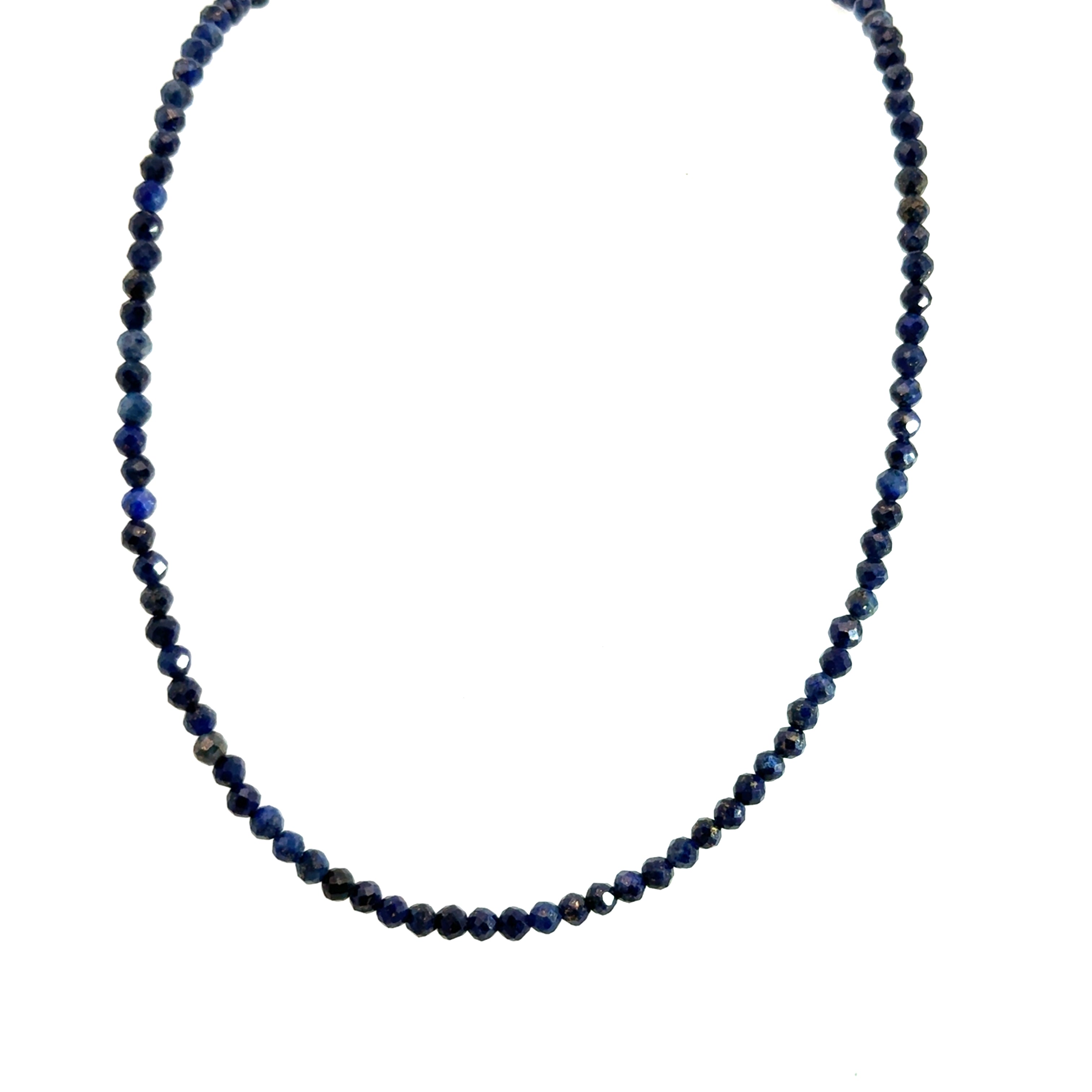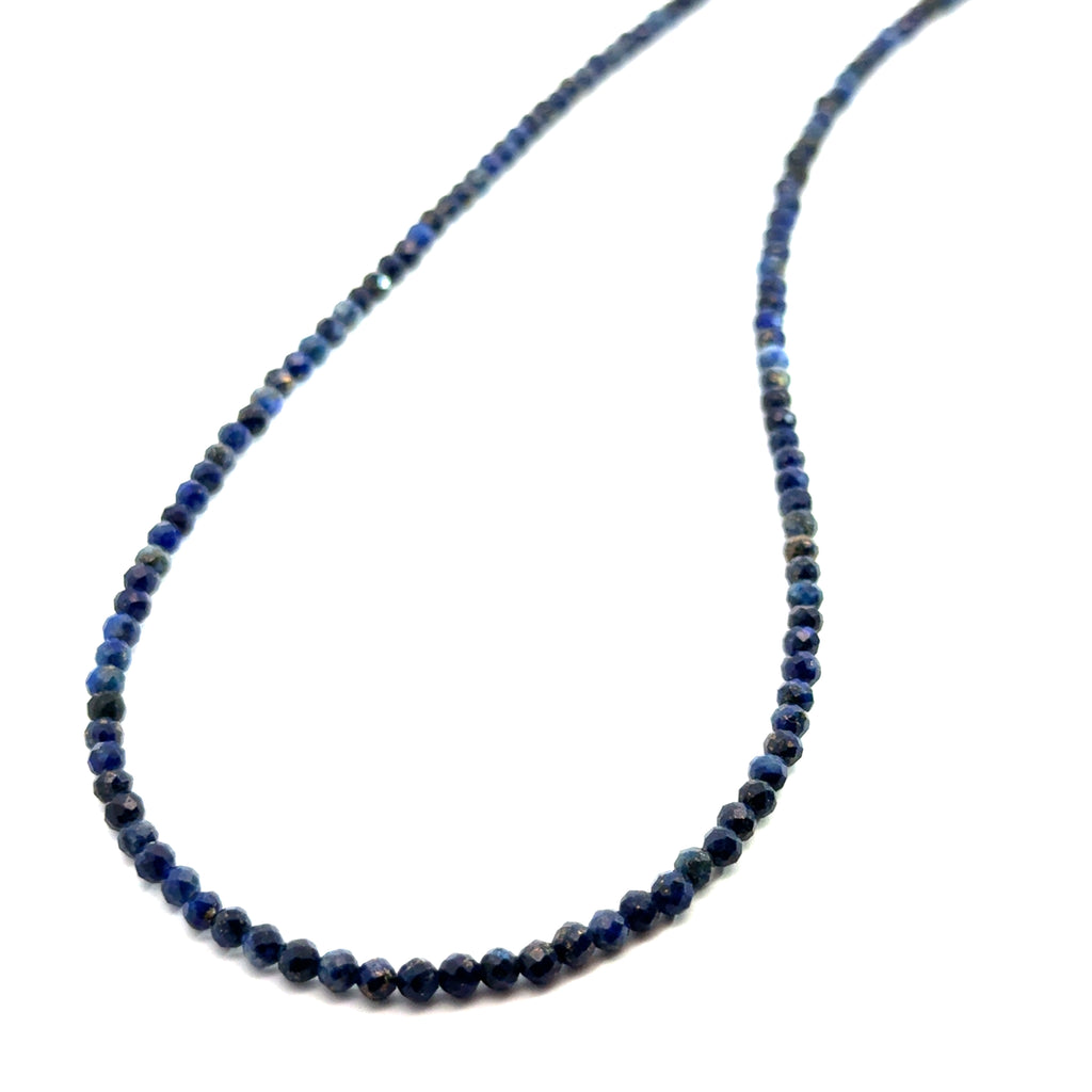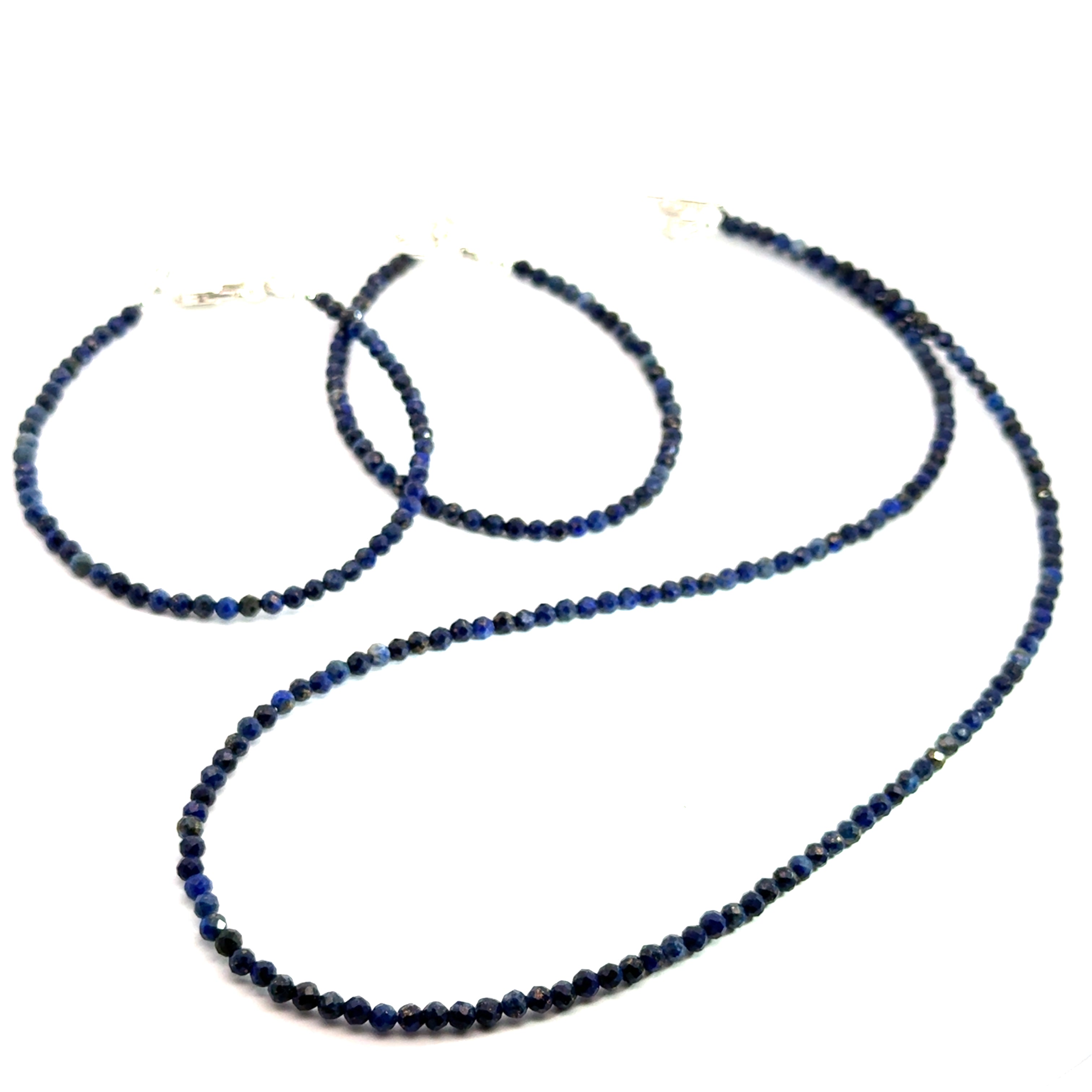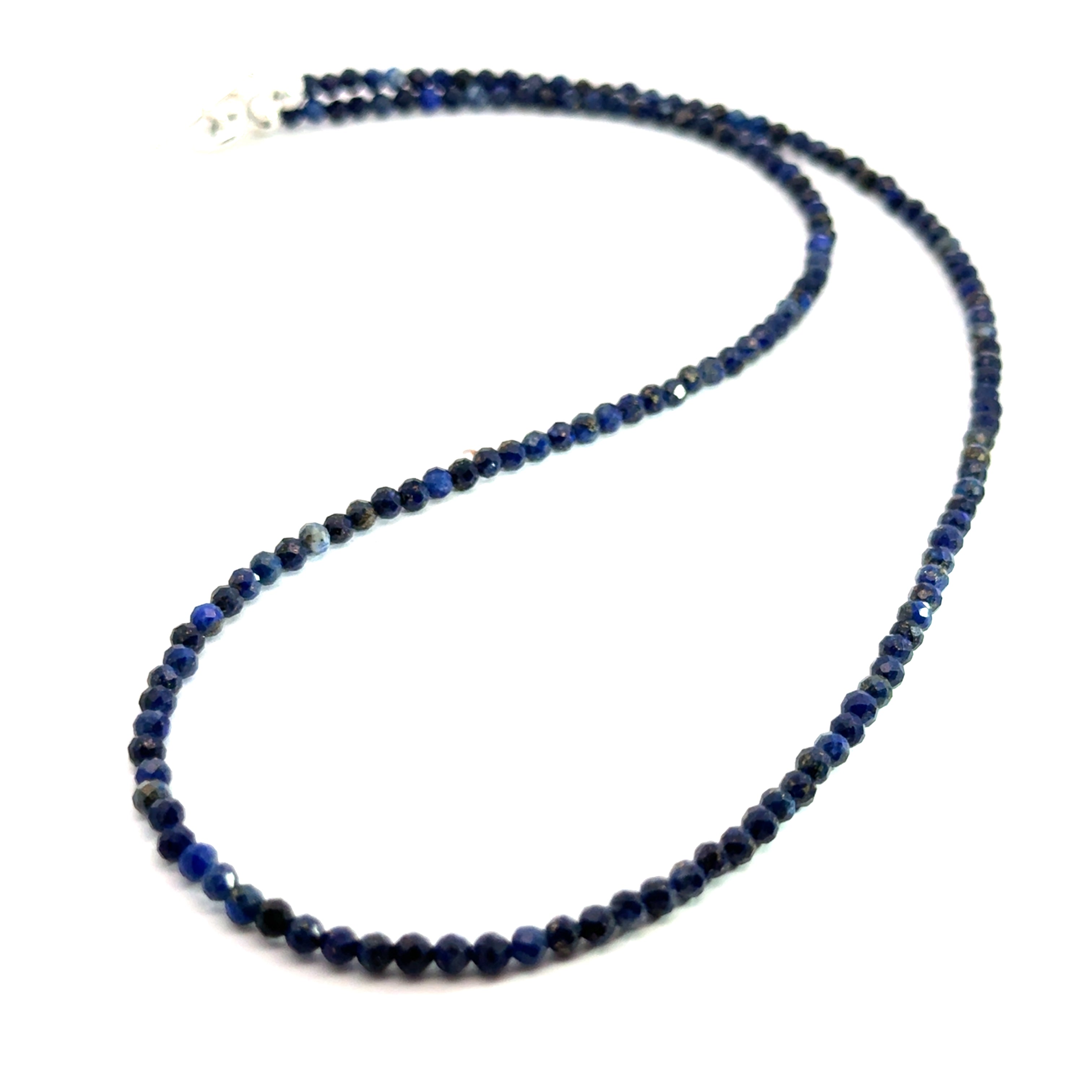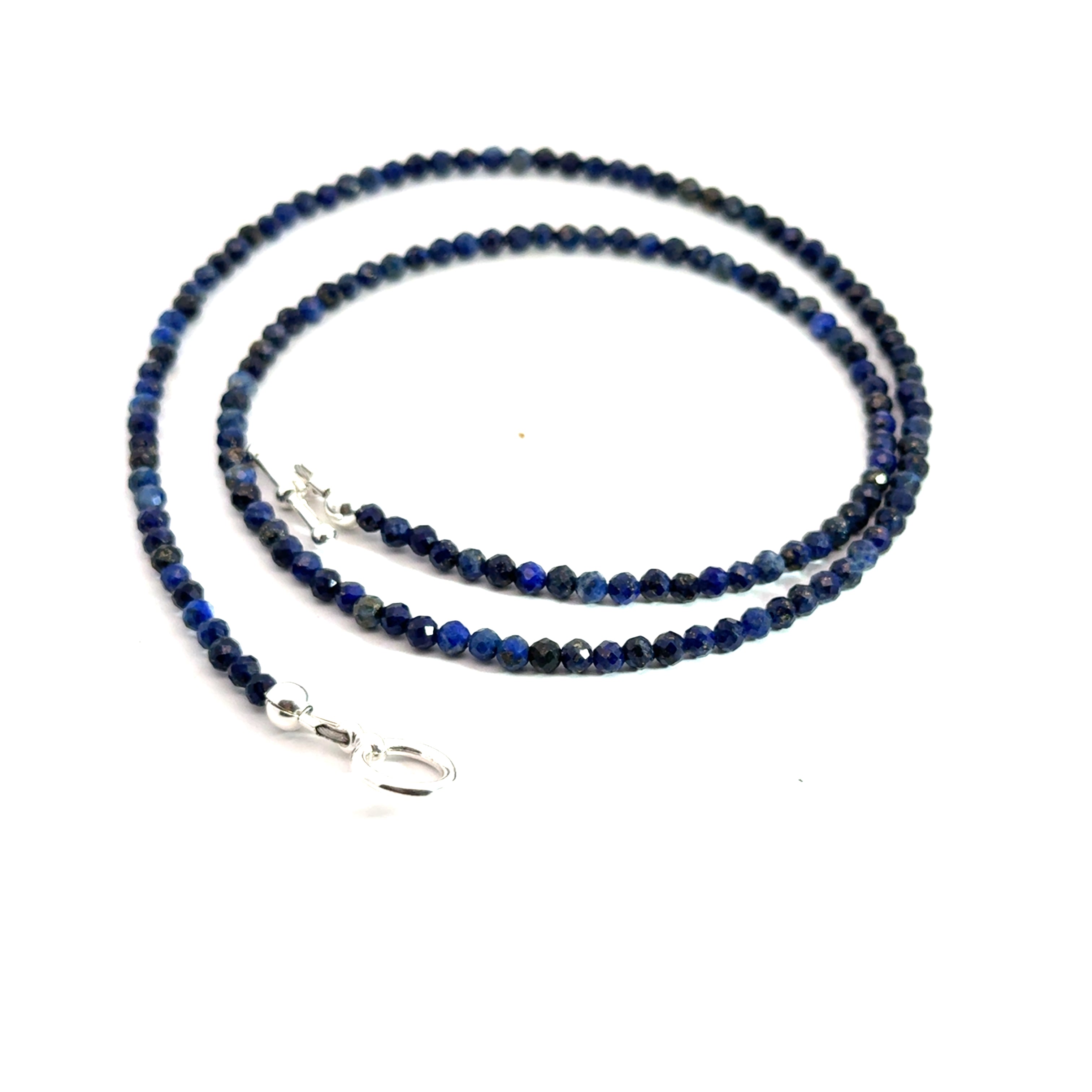 Genuine Lapis Lazuli 3mm faceted gemstones single strand necklace with a sterling silver toggle. The necklace measures out to 18.5''. The Lapis Lazuli necklace is exquisite but simple. A great piece to have in one's collection, perfect for daily wear or a special occasion. A necklace that could be worn by itself or layered with others. A must-have. There is a matching bracelet if you like to match your jewelry. There is also matching bracelets that are sold separately if you love matching jewelry sets.