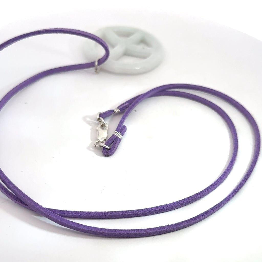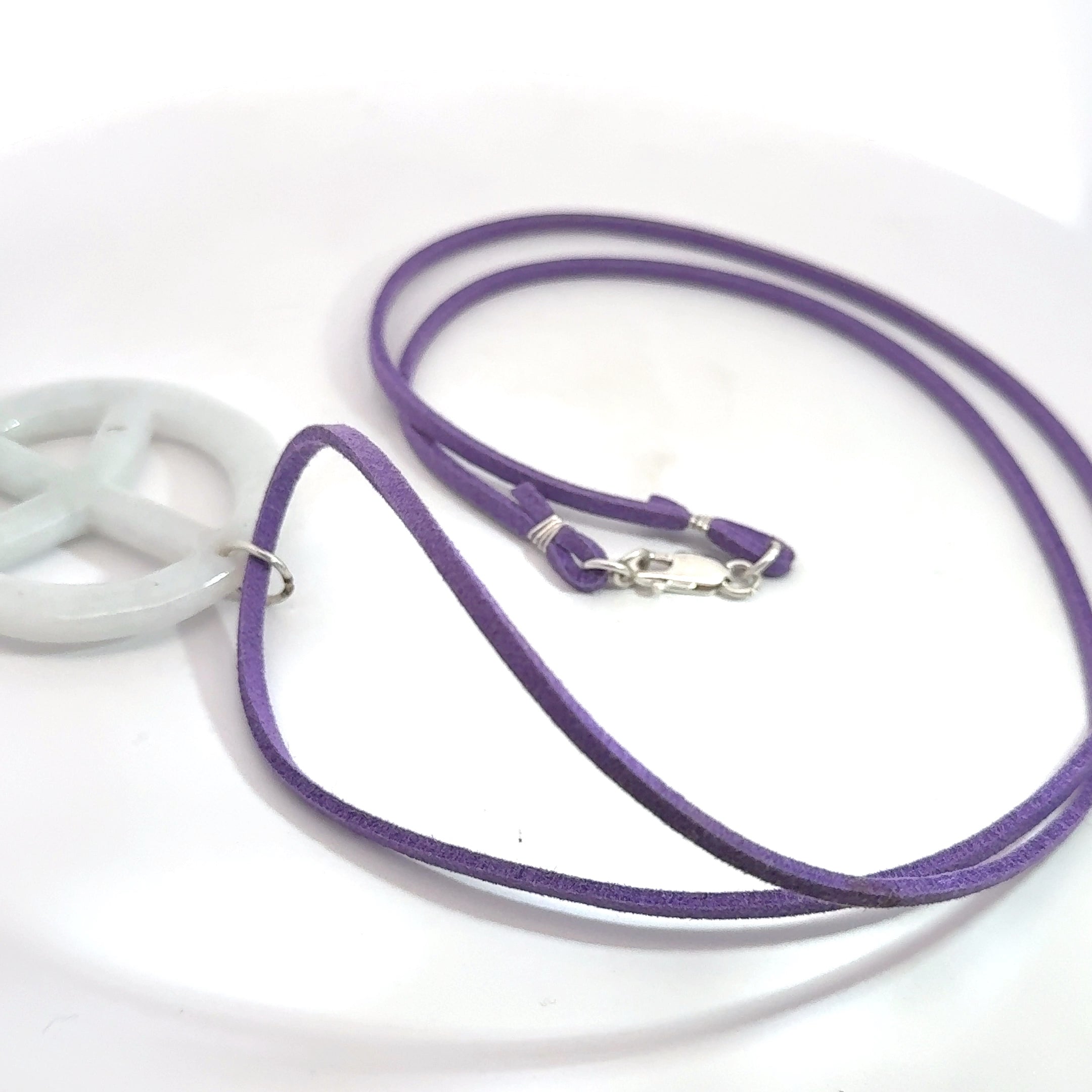 Green Jade Peace Pendant Necklace – 1.75" Gemstone on Purple Suede Cord, 29"Green Jade Peace Pendant Necklace – 1.75" Gemstone on Purple Suede Cord, 29"