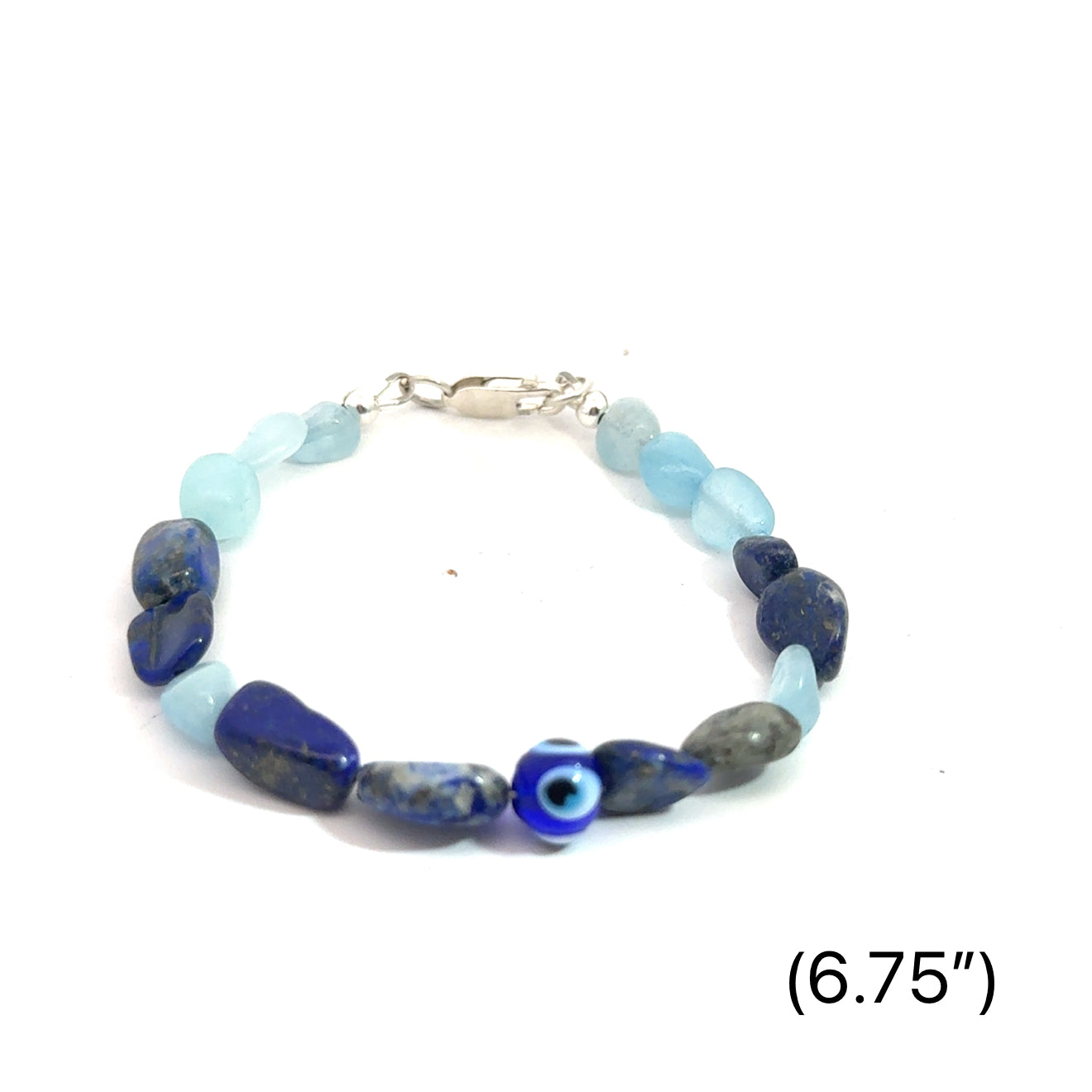 Elevate your jewelry collection with this stunning gemstone beaded bracelet, featuring a harmonious blend of Lapis Lazuli, Aquamarine, and Labradorite gemstones. Designed with 5mm pebble-shaped beads and accented by three focal glass evil-eye beads, this bracelet is finished with a sterling silver lobster-claw clasp for durability and elegance. Measuring 6.75"–7.75", it offers a comfortable fit for everyday wear.