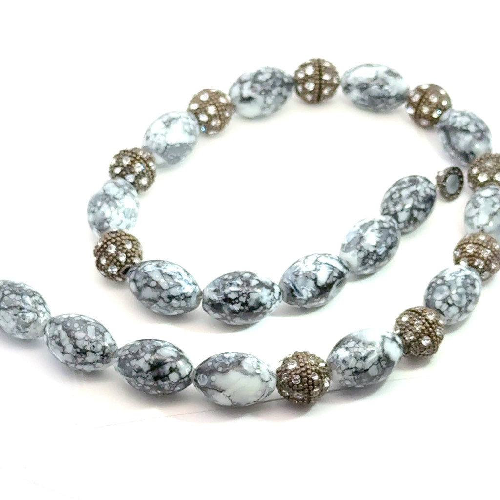 Elegant Design: Black and white marbled oval beads (13x20mm) with brown metal CZ accents (12mm)