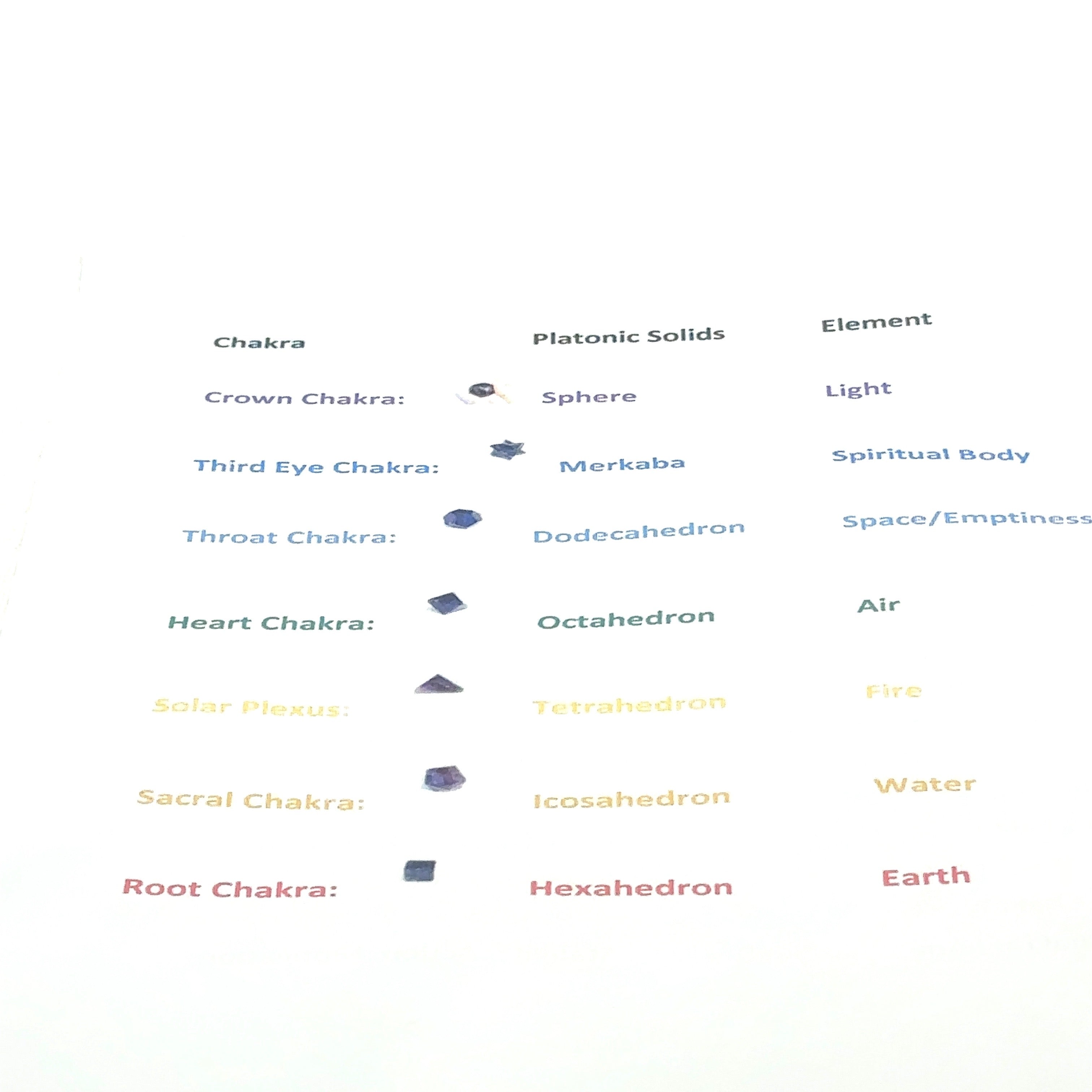 For chakra alignment, place each platonic solid on its corresponding chakra for 15–30 minutes of meditation. After your session, remove the stones in reverse order — from the Crown Chakra down to the Root Chakra — to gently ground your energy.
