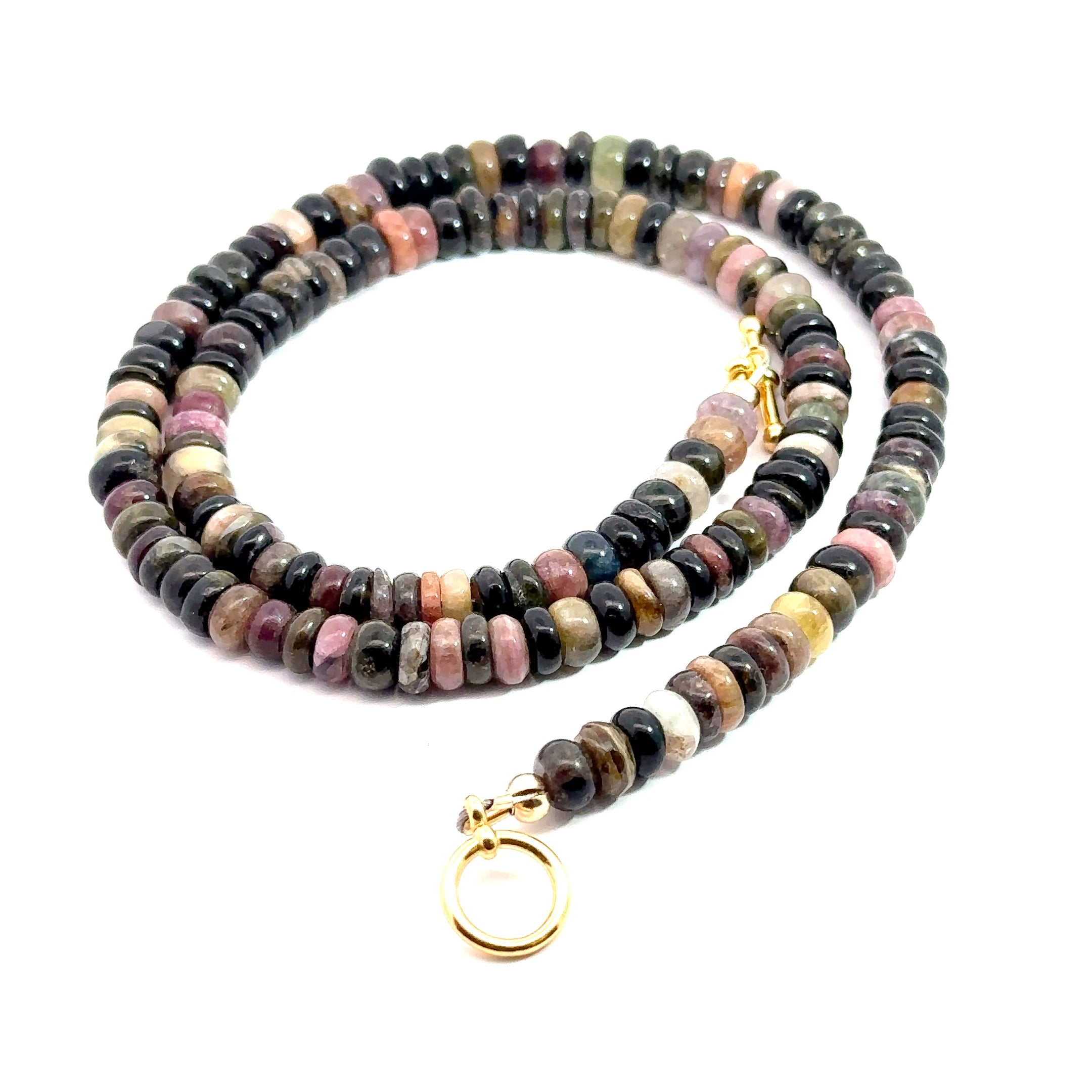 Introducing our Genuine Watermelon Tourmaline Gemstone Necklace, a genuinely unique piece inspired by the vibrant colors of an autumn garden in bloom. Crafted with smooth, multi-colored Tourmaline roundels and accented with a touch of gold, this necklace is finished with an elegant gold-filled toggle clasp for timeless sophistication.